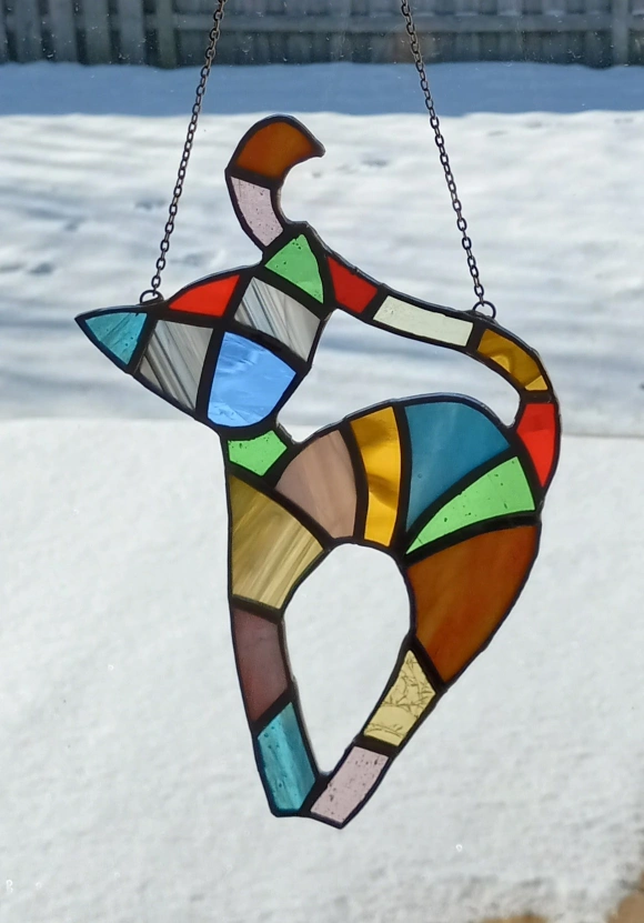 Handmade multicoloured stained glass cat suncatcher. hangs at approx 12.5 inches.