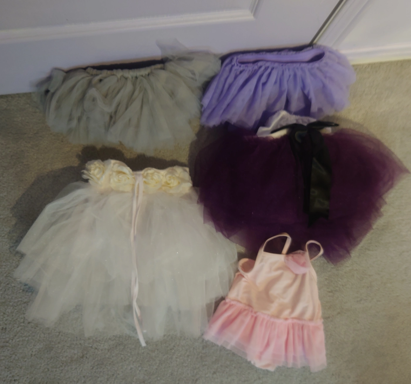 Assortment of five girls' tutus. Various colours and styles. One includes a leotard. Great for dance, dress-up, or parties.