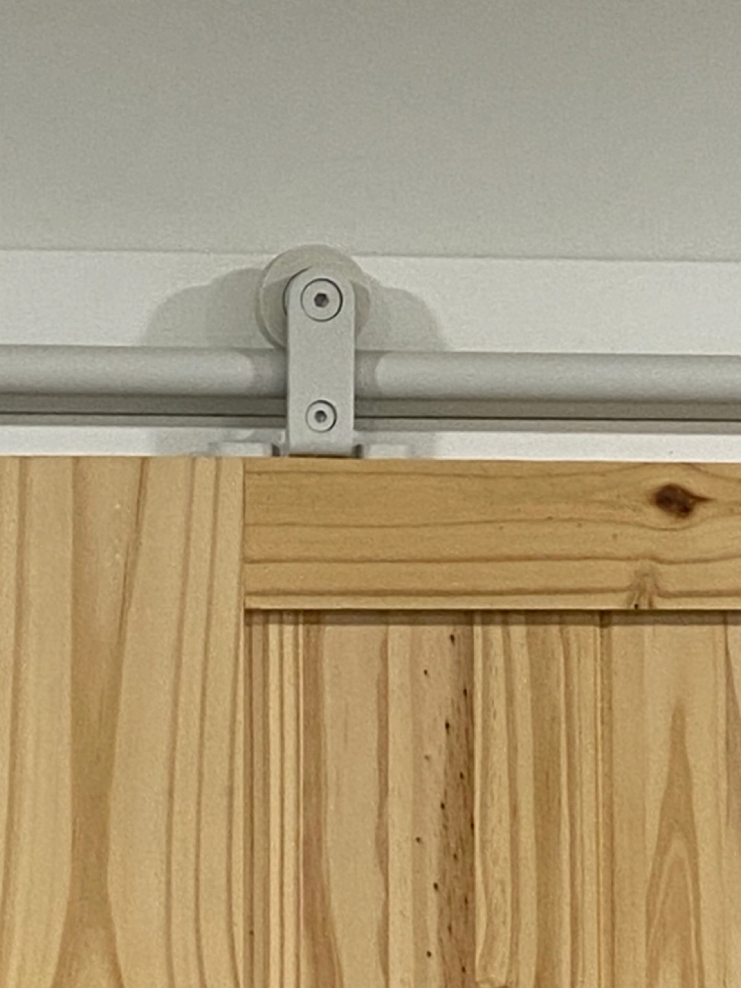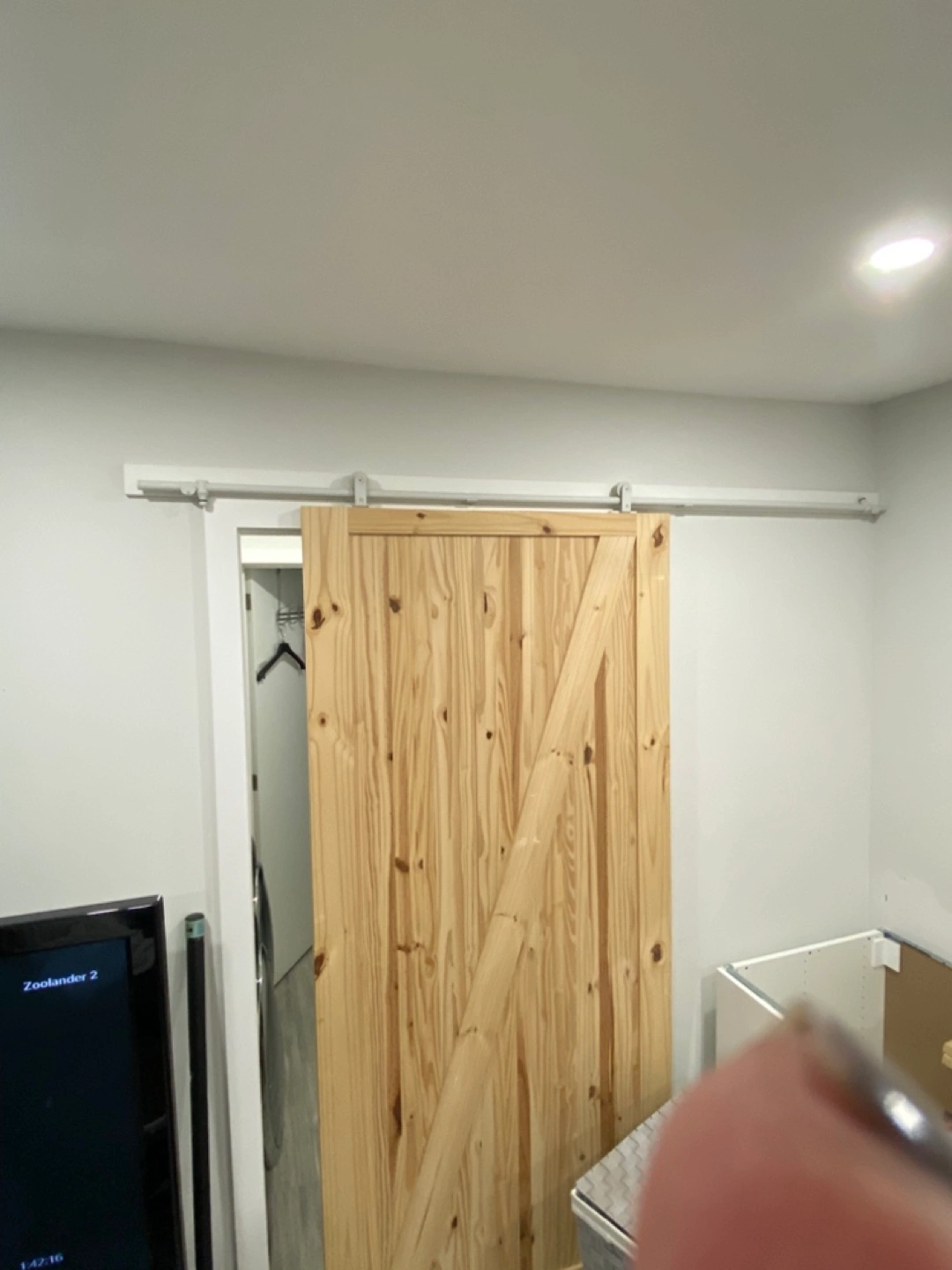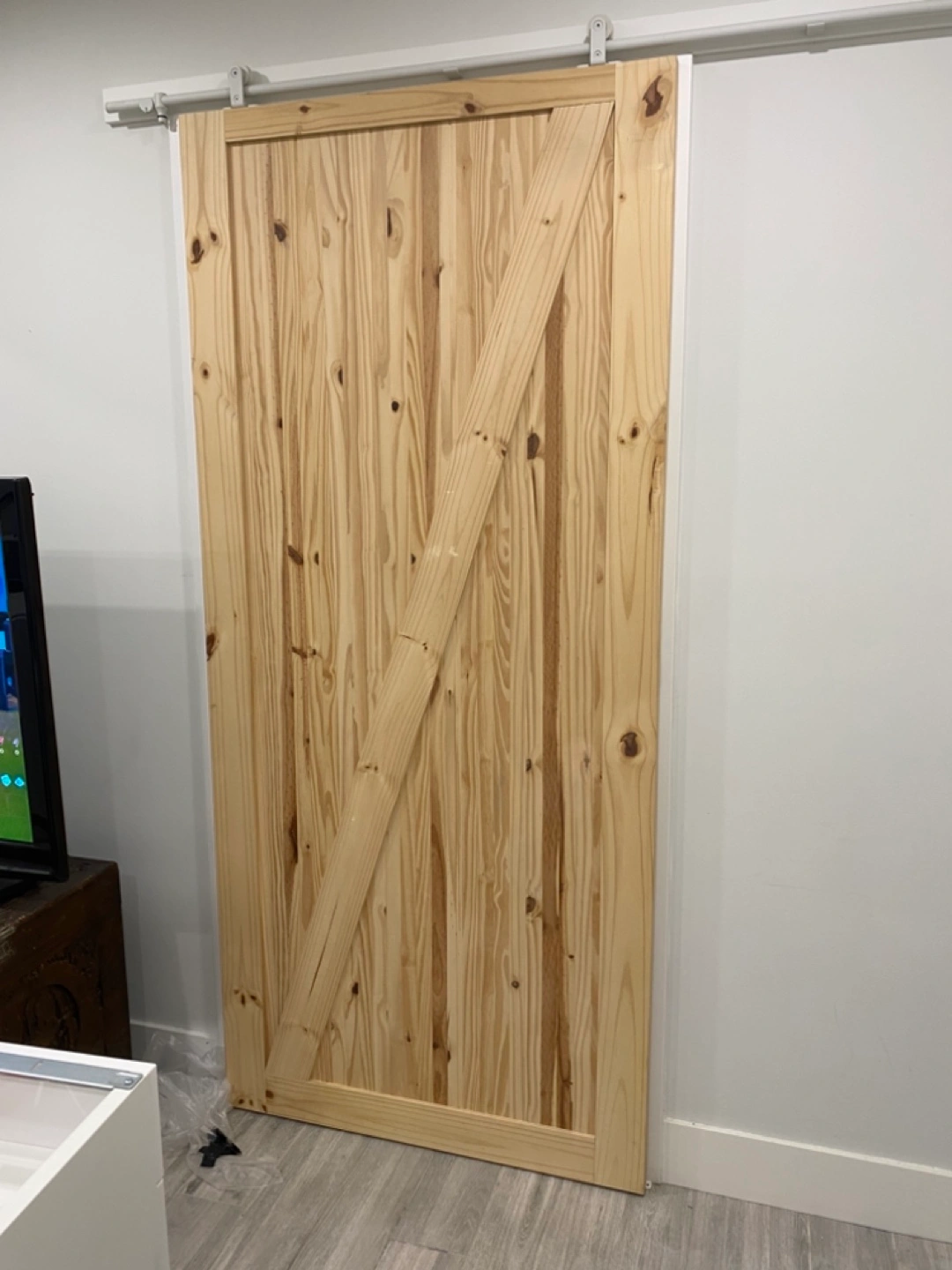 2 Sliding barn doors. Pine wood doors. White hardware. Includes track and rollers for both doors. Perfect for closets or room dividers. Easy installation. Pre-owned, good condition.