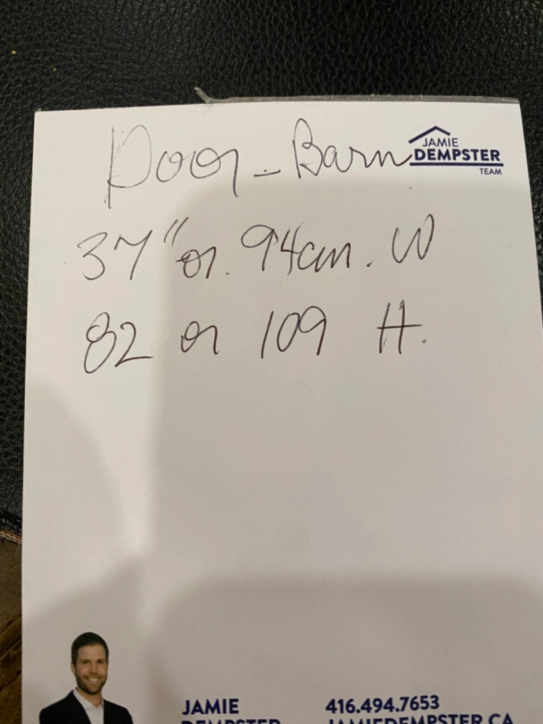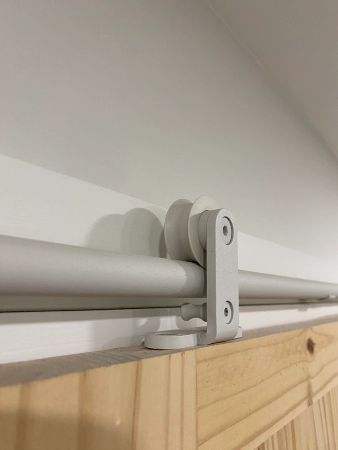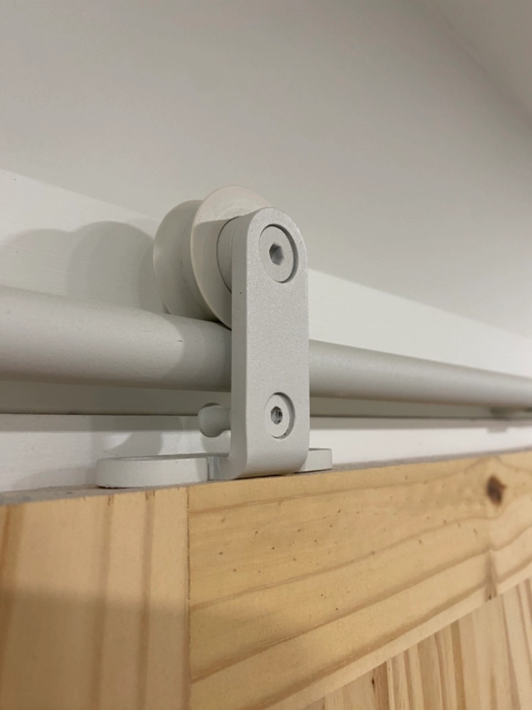2 Sliding barn doors. Pine wood doors. White hardware. Includes track and rollers for both doors. Perfect for closets or room dividers. Easy installation. Pre-owned, good condition.