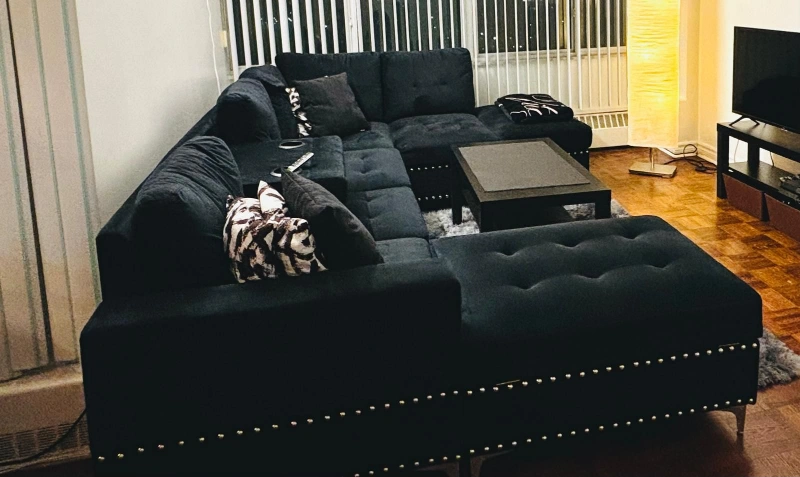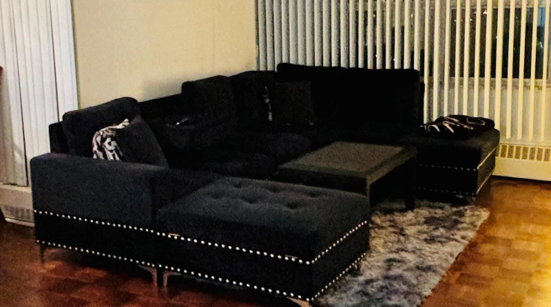 Black Velvet L-Shaped Sectional Sofa with Ottoman