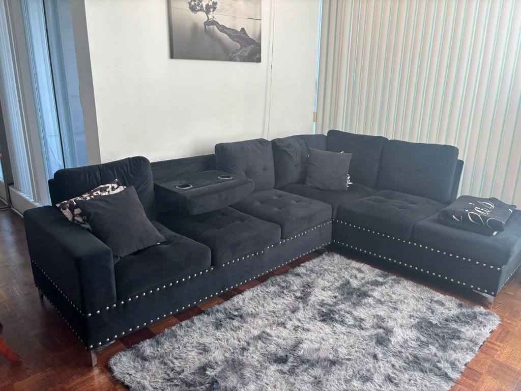 Luxurious black velvet sectional sofa. Features button tufting and metallic nailhead trim. Includes an ottoman and centre console. Modern design, perfect for a contemporary living room.