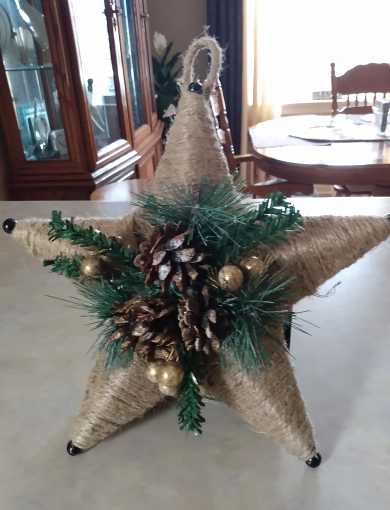 Beautiful handmade Christmas star ornament. Features burlap construction, pine cones, and gold accents. Perfect for adding a touch of rustic charm to your holiday décor. Ready to hang.