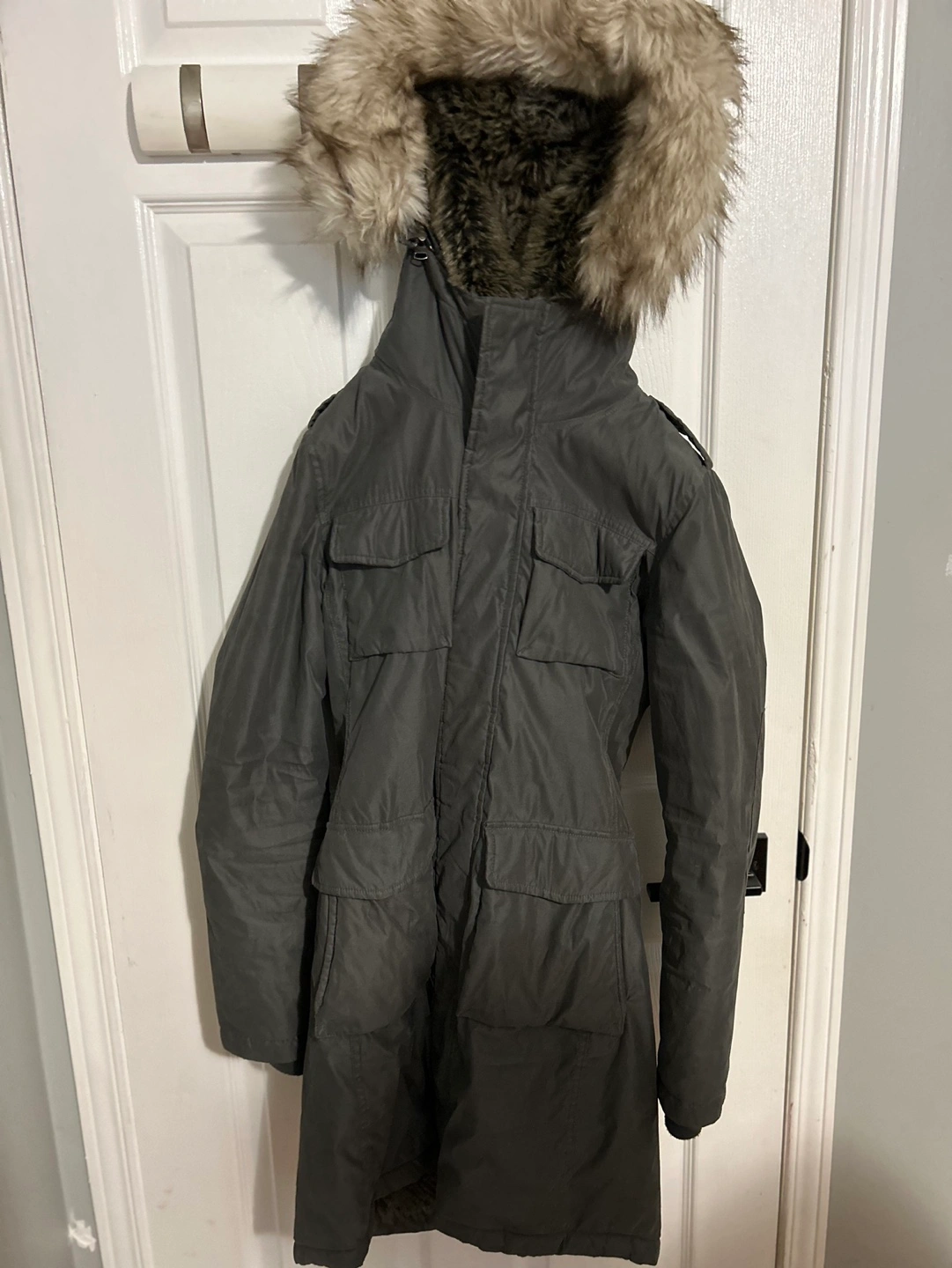 Warm winter parka. Long length. Faux fur-trimmed hood. Multiple pockets. Great condition.