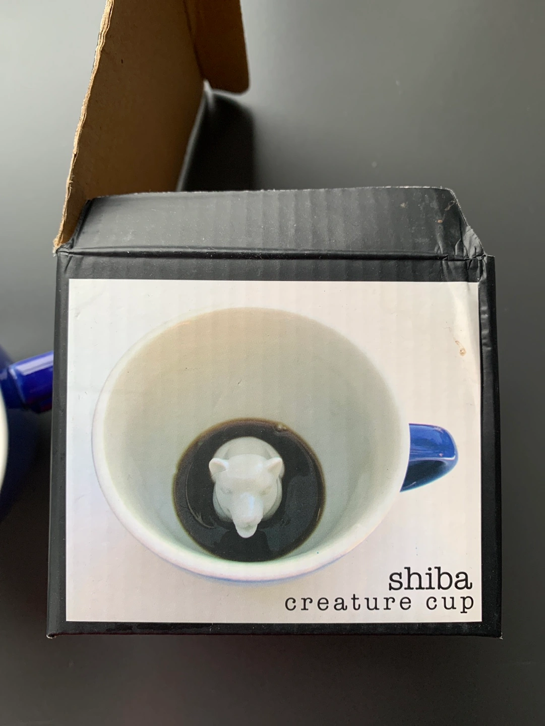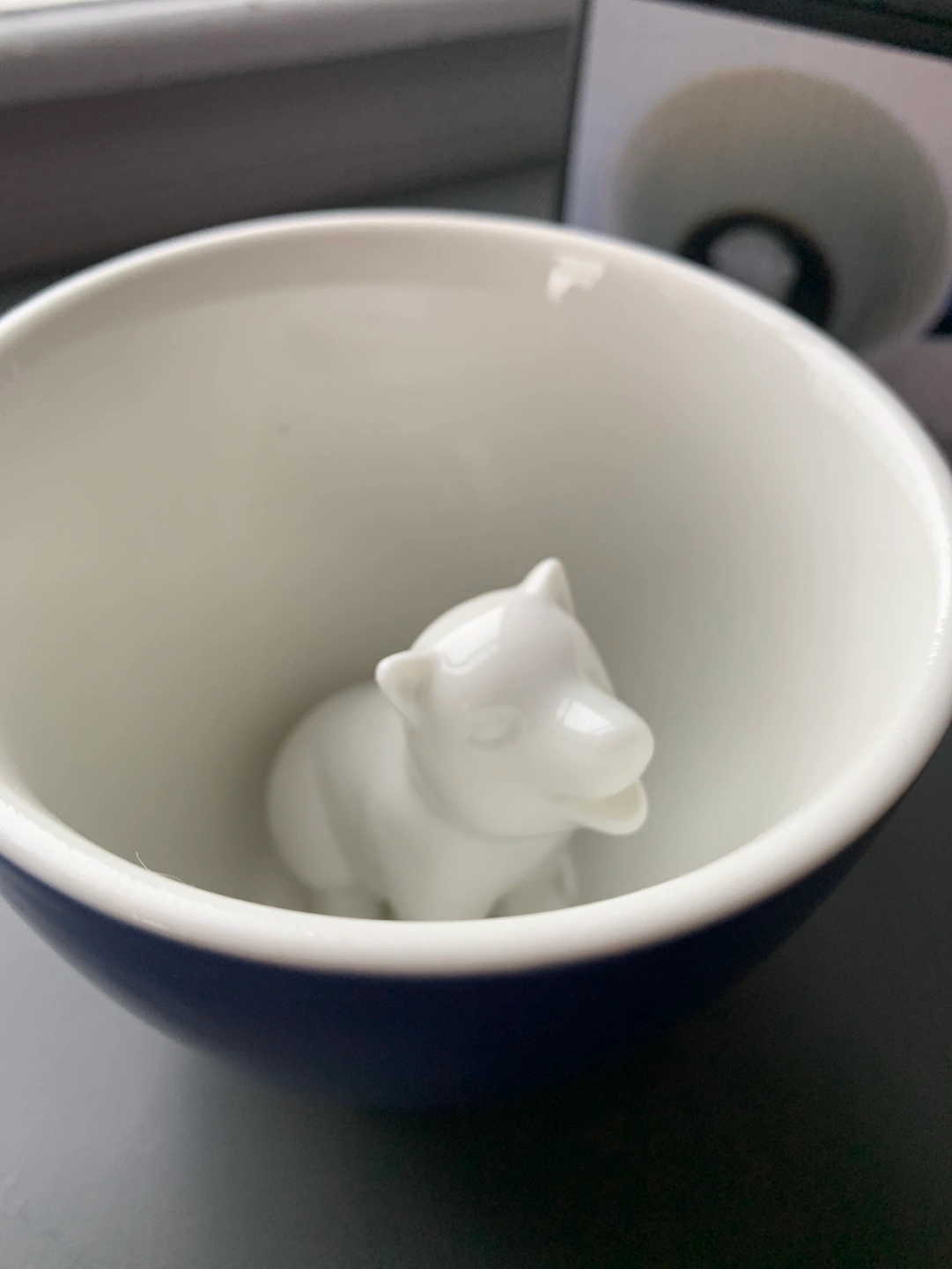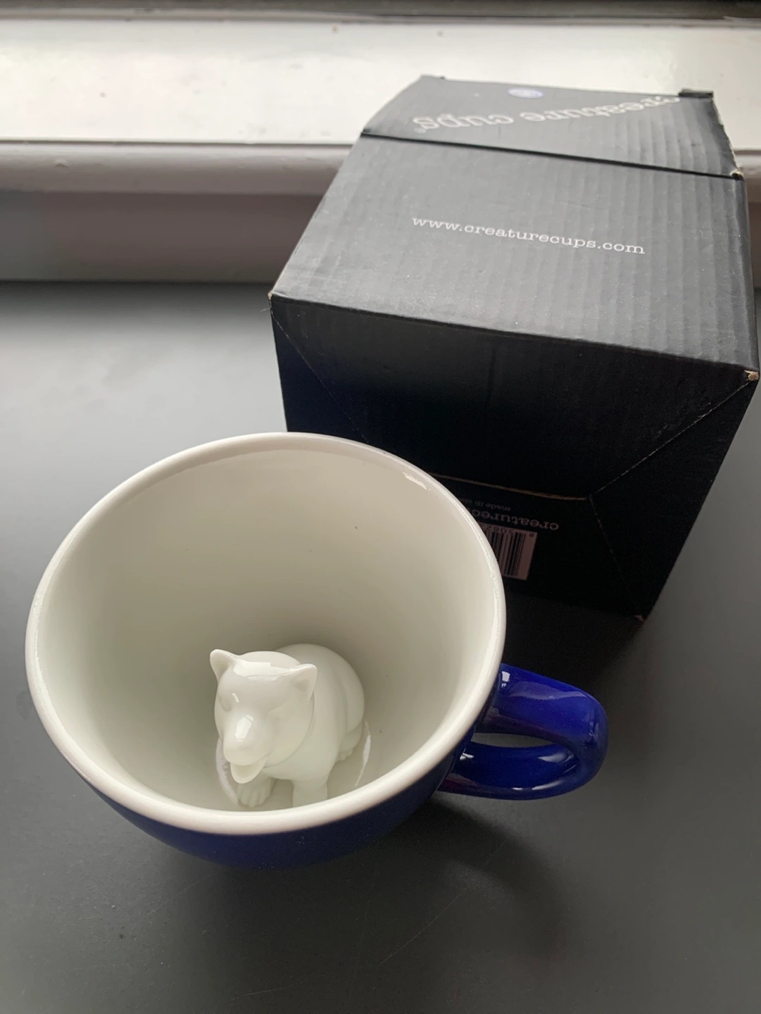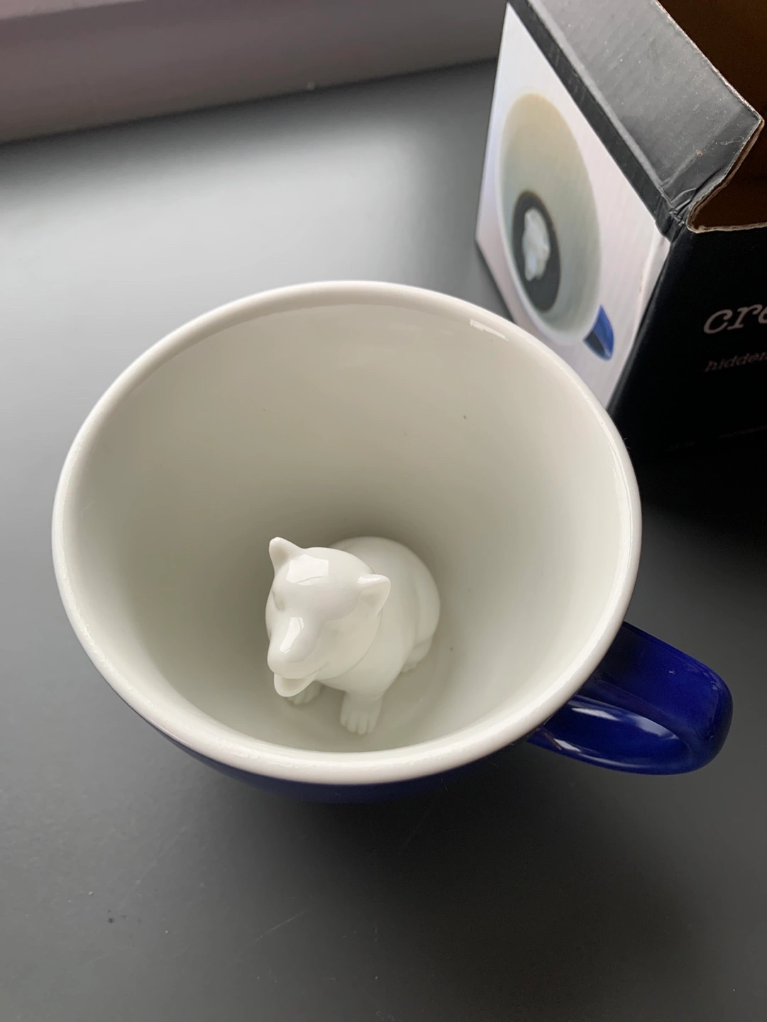Blue exterior, white interior. Features a small hidden creature inside - white bear. Comes in original box.