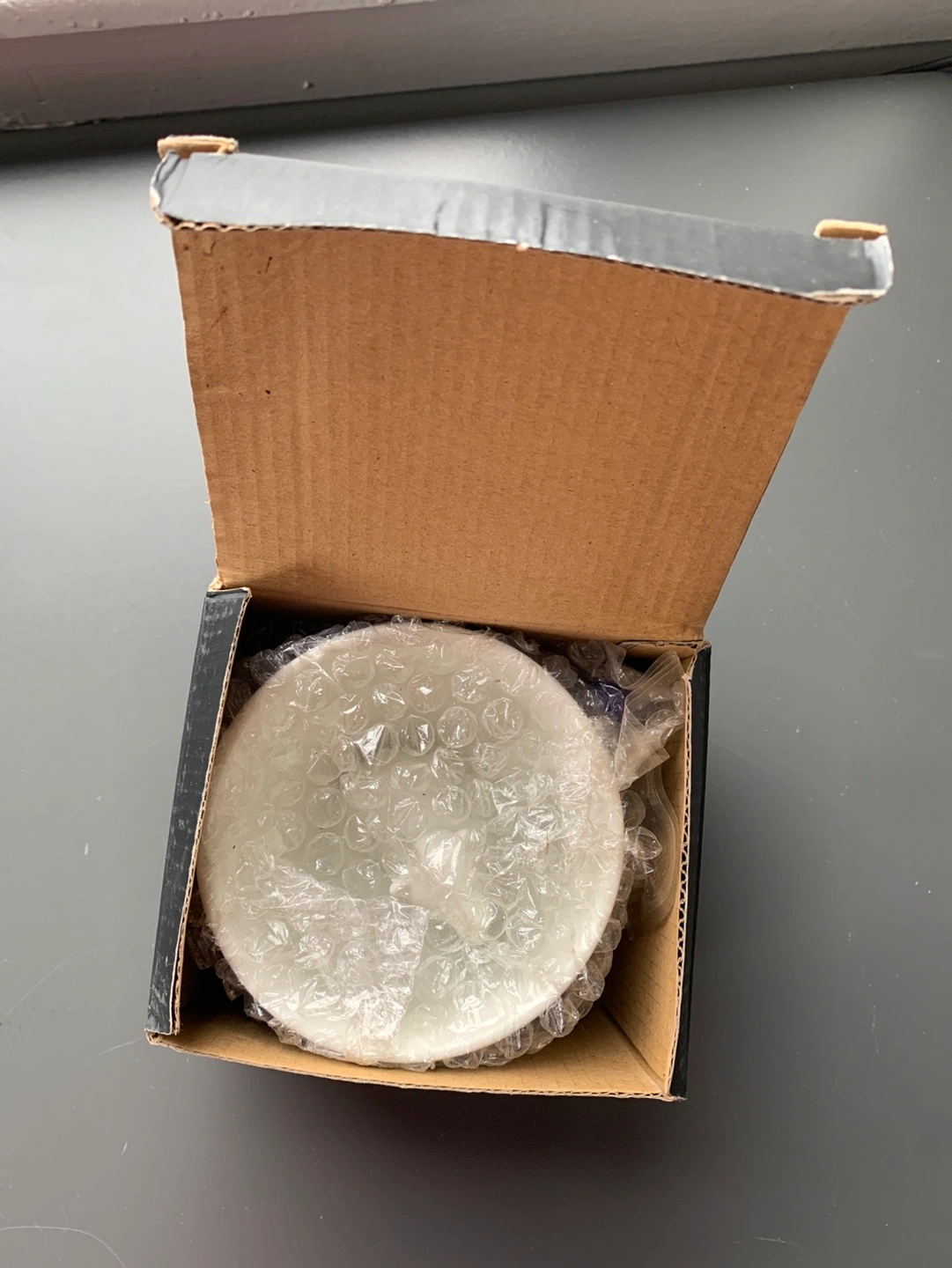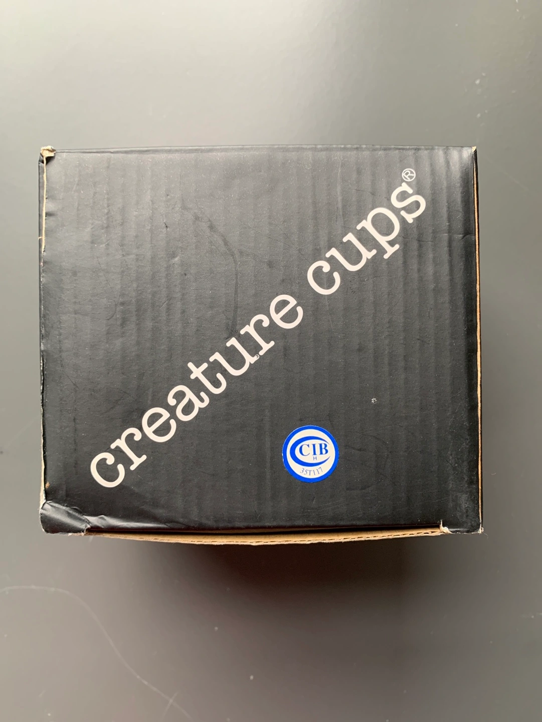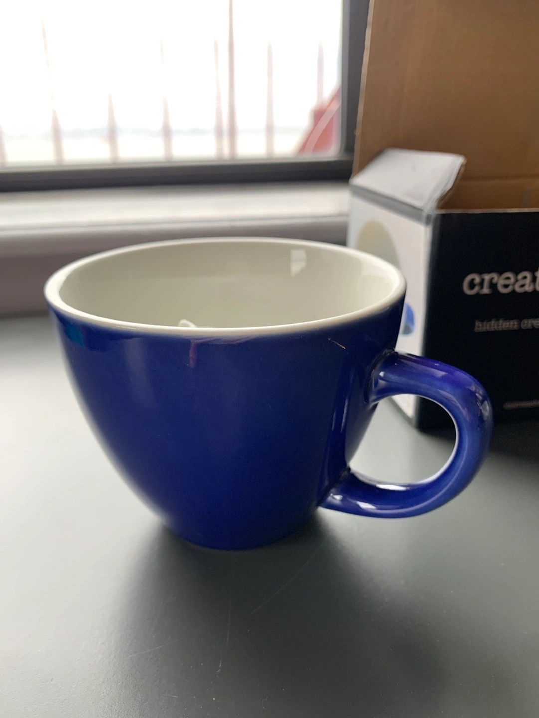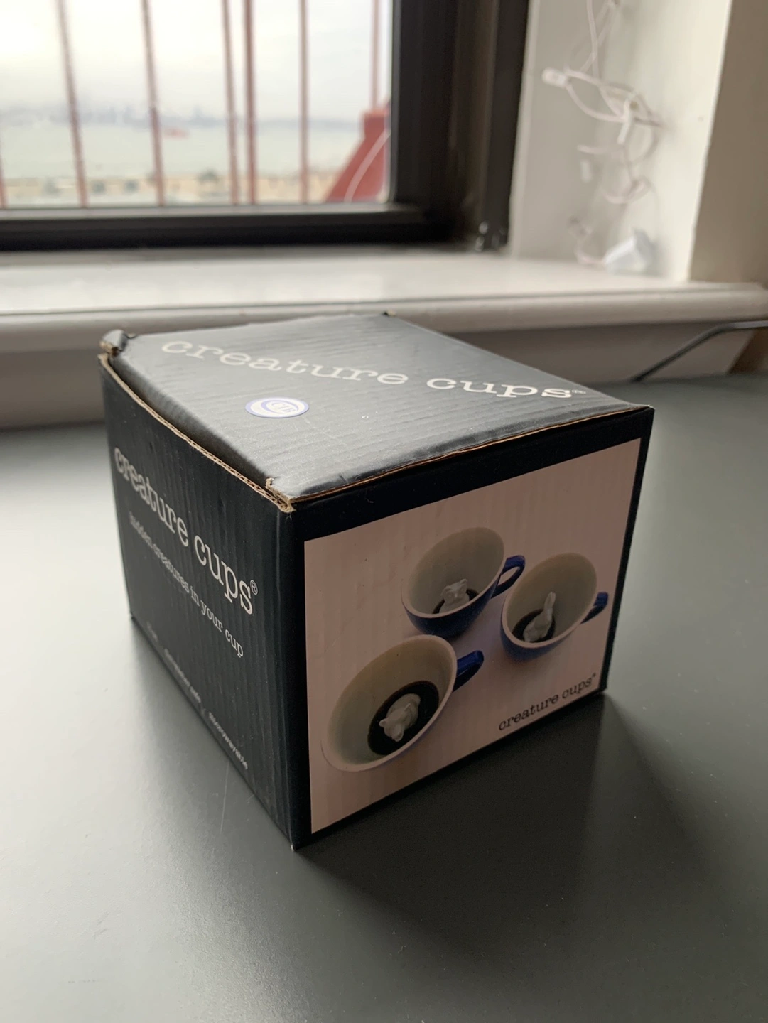 Blue exterior, white interior. Features a small hidden creature inside - white bear. Comes in original box.