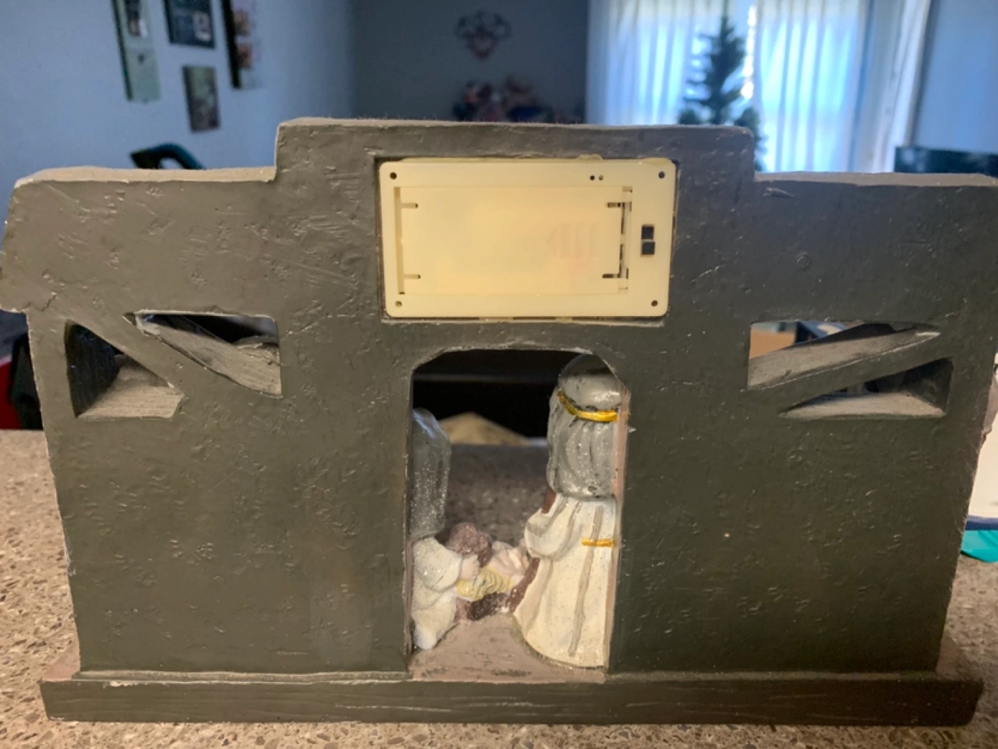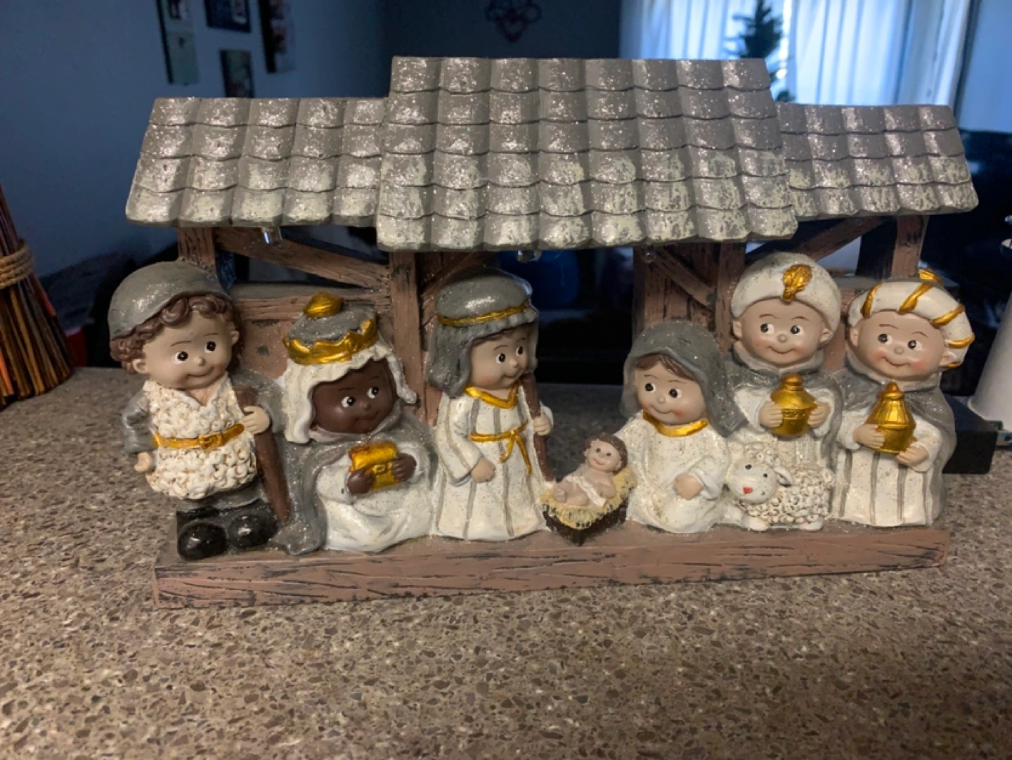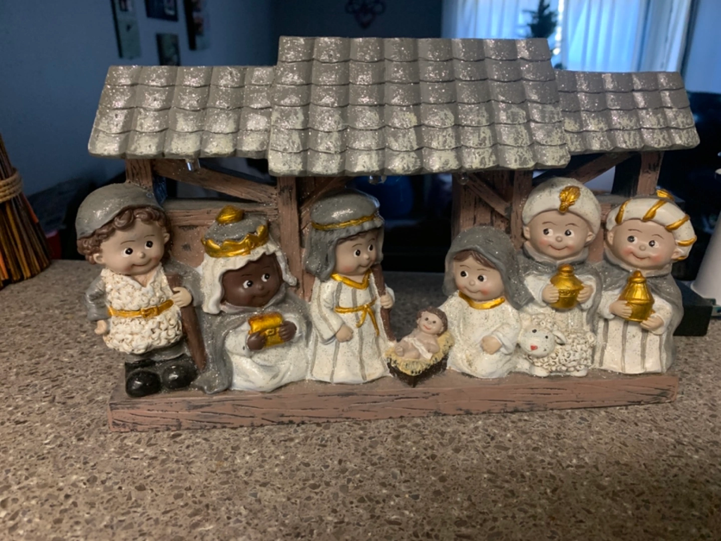 Adorable light-up nativity scene. Features a stable with Mary, Joseph, baby Jesus, and the three wise men. Perfect Christmas decoration. Small, tabletop size. Takes double A batteries