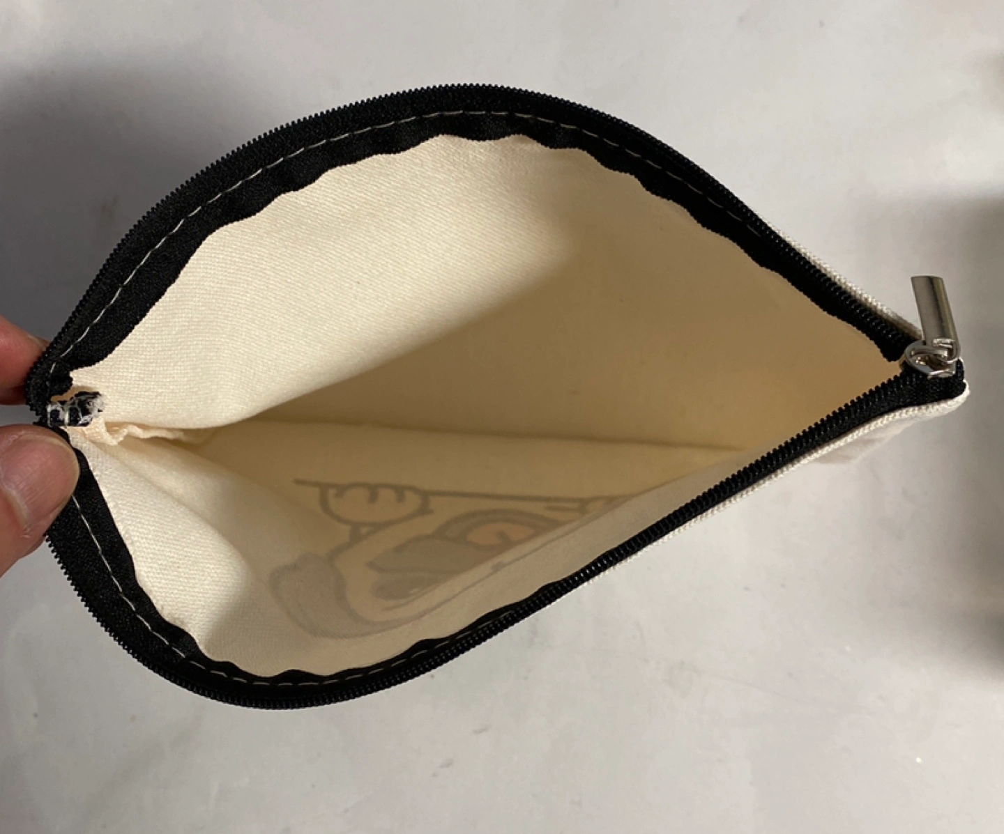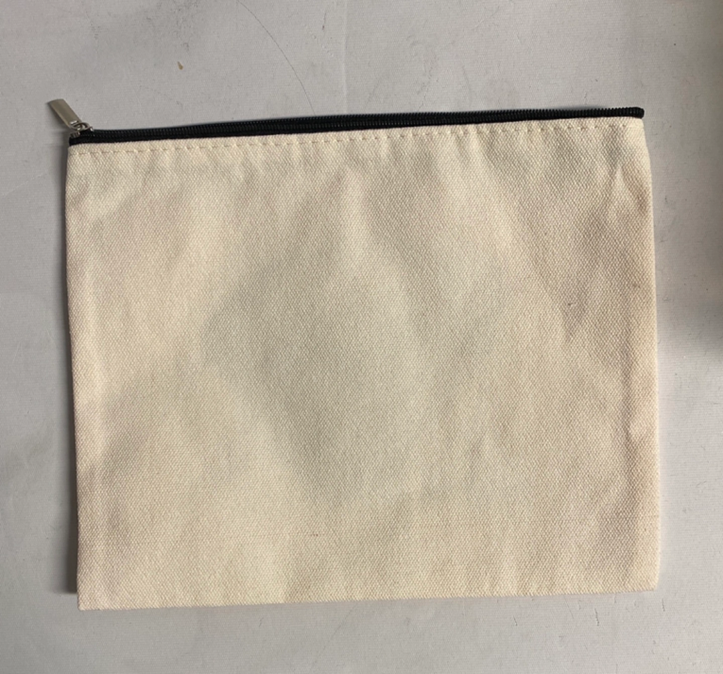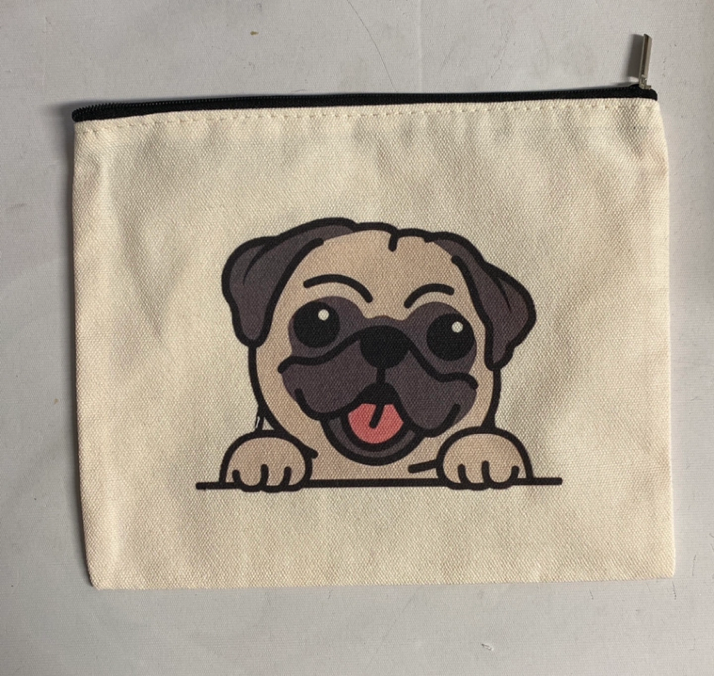 Canvas zipper pouch. Features a cute pug design. Perfect for storing small items. Has a black zipper. Size 9x7 inches