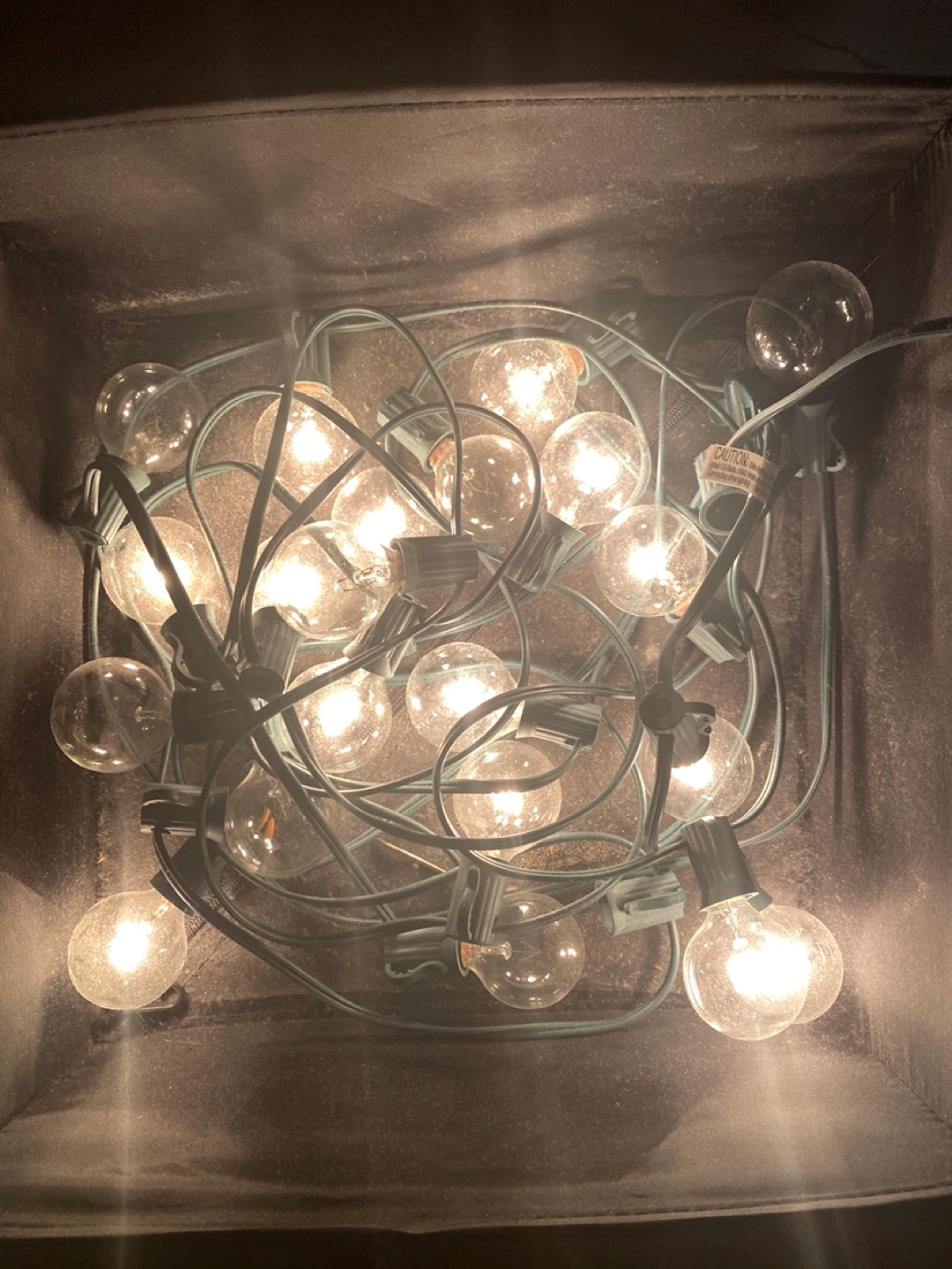 Indoor string lights. Green wire, clear glass bulbs. Perfect for bedroom or playroom.
