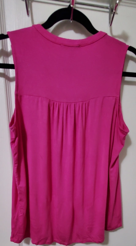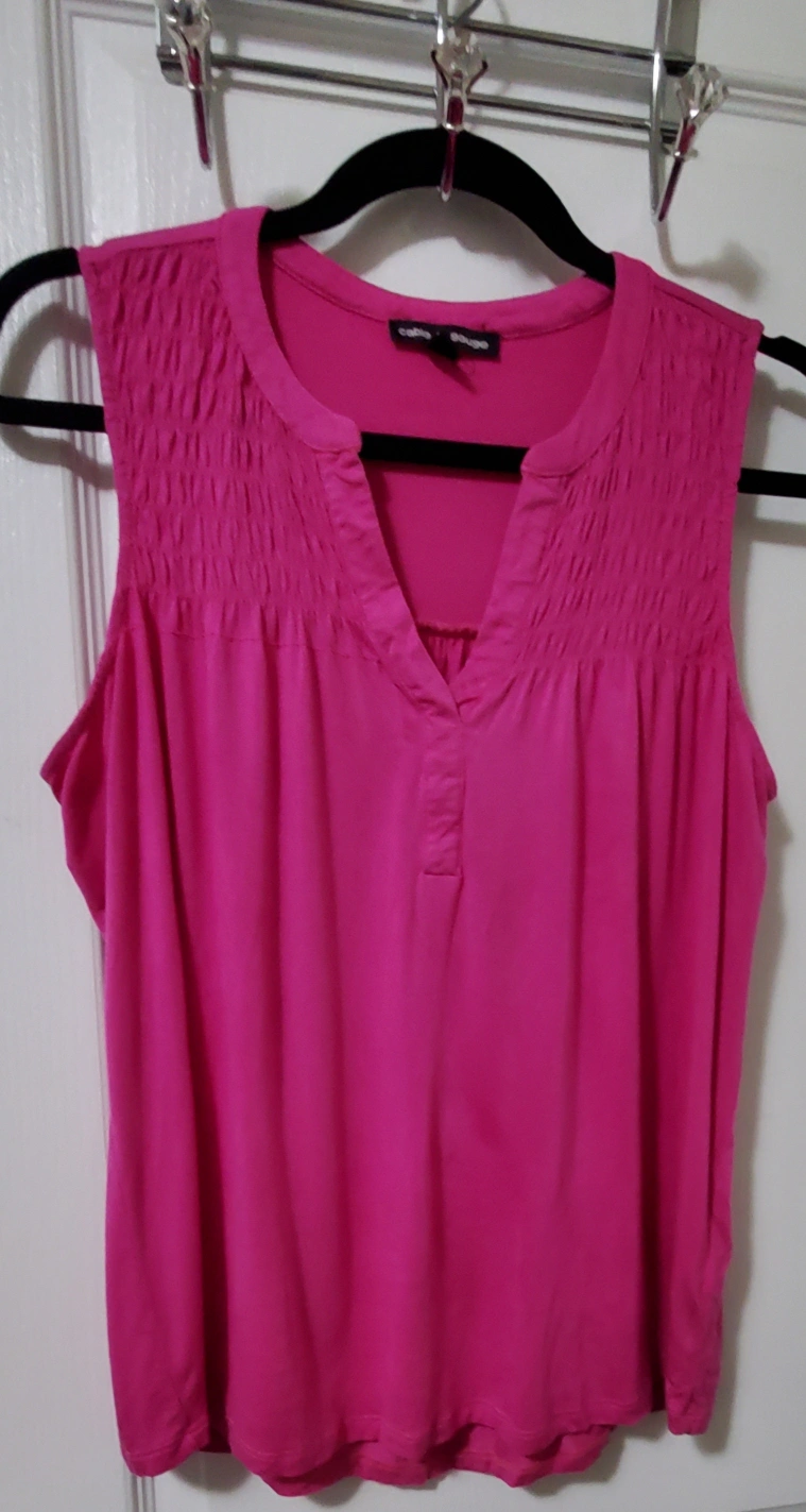 Never worn. Women's sleeveless top. Relaxed fit. Slight V-neck. Smocked detail at the neckline. Lightweight fabric.