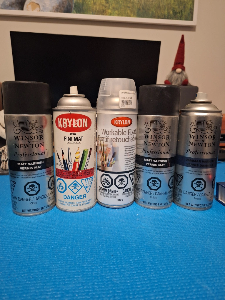 Set of five spray paint cans. Two Krylon cans, three Winsor & Newton cans. Various finishes and sizes. Check images for details. Wife can't take the odor, can't be used in home.