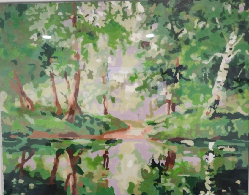 Beautiful paint landscape. Depicts a tranquil forest scene with a reflective pond. Presented in a simple white frame. Ready to hang on wood frame.