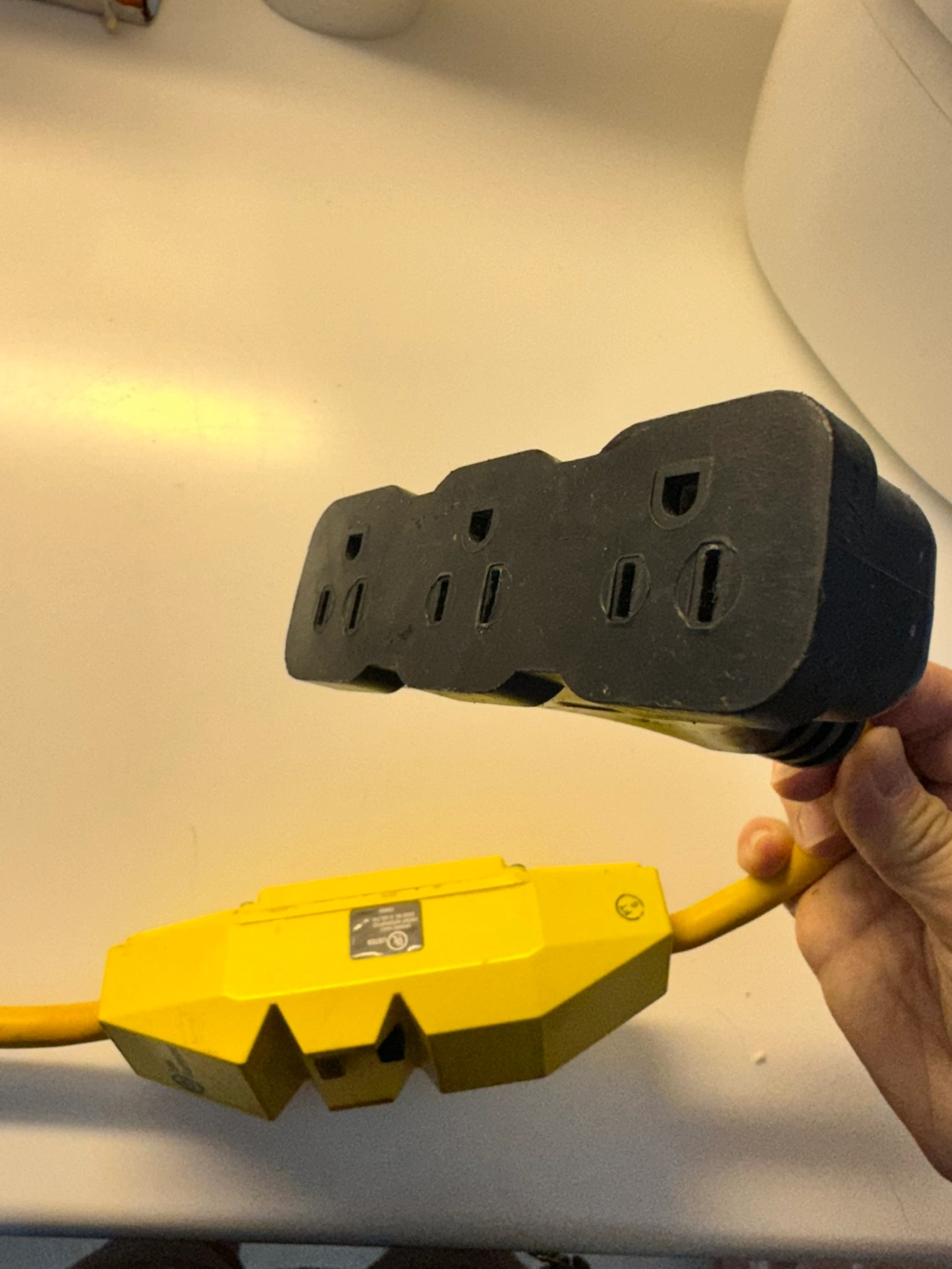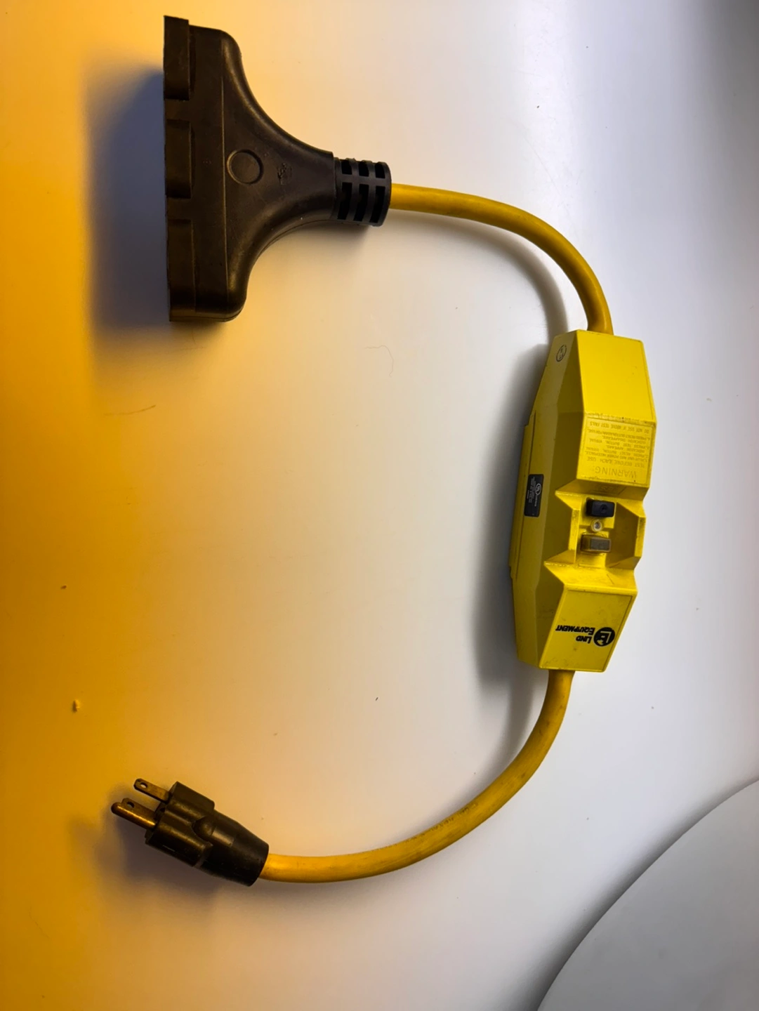 Yellow GFCI power outlet with attached extension cord. Features a three-pronged plug and three receptacles. Used but in good condition.