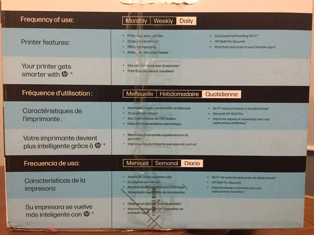 All-in-one printer. High-speed printing and plenty of paper input. Advanced mobile tools. HP Wolf Pro Security. Works with Apple AirPrint, Apple Beacon, Android, Chromebook. Wi-Fi and Bluetooth enabled. Energy Star certified.