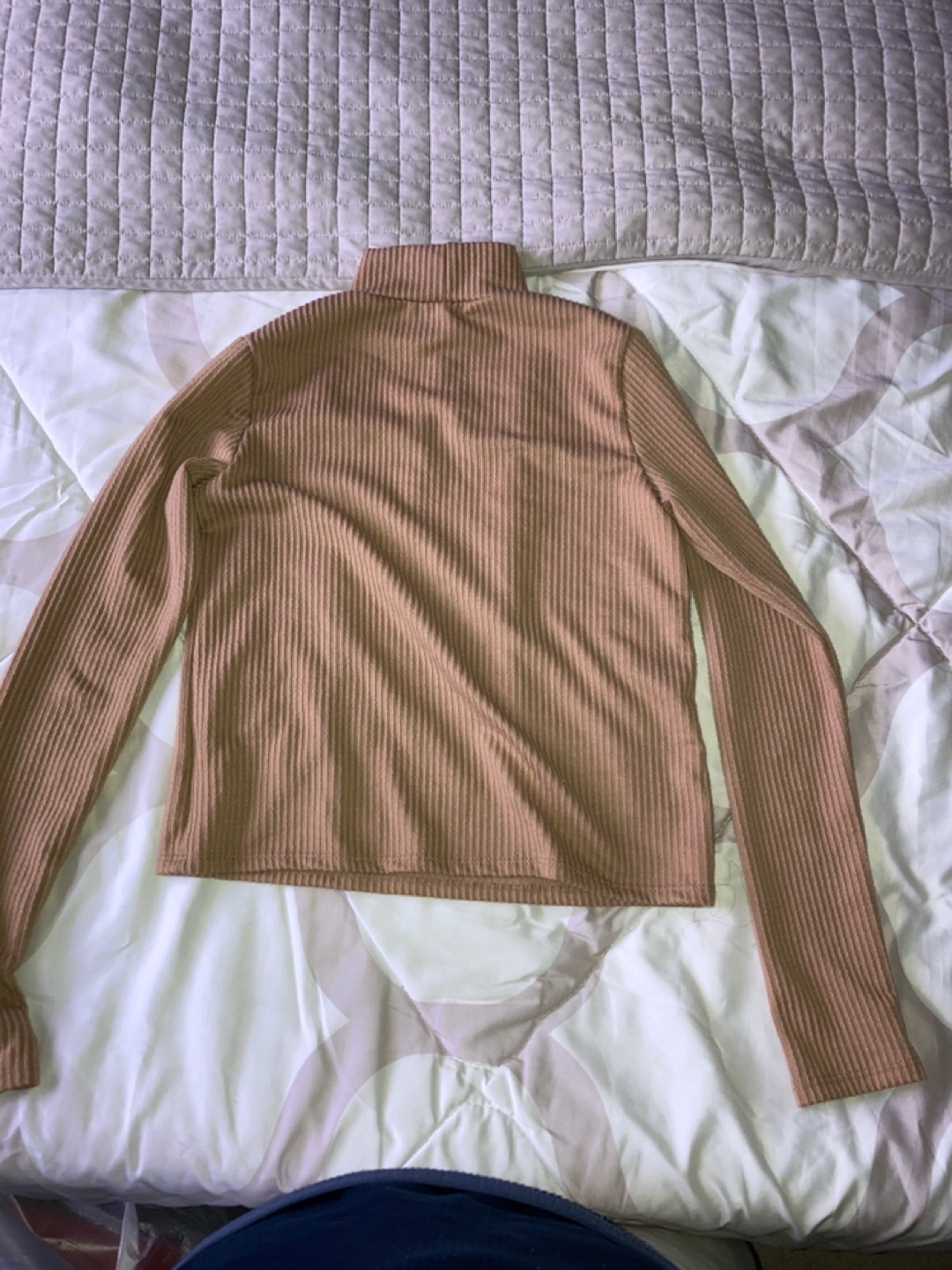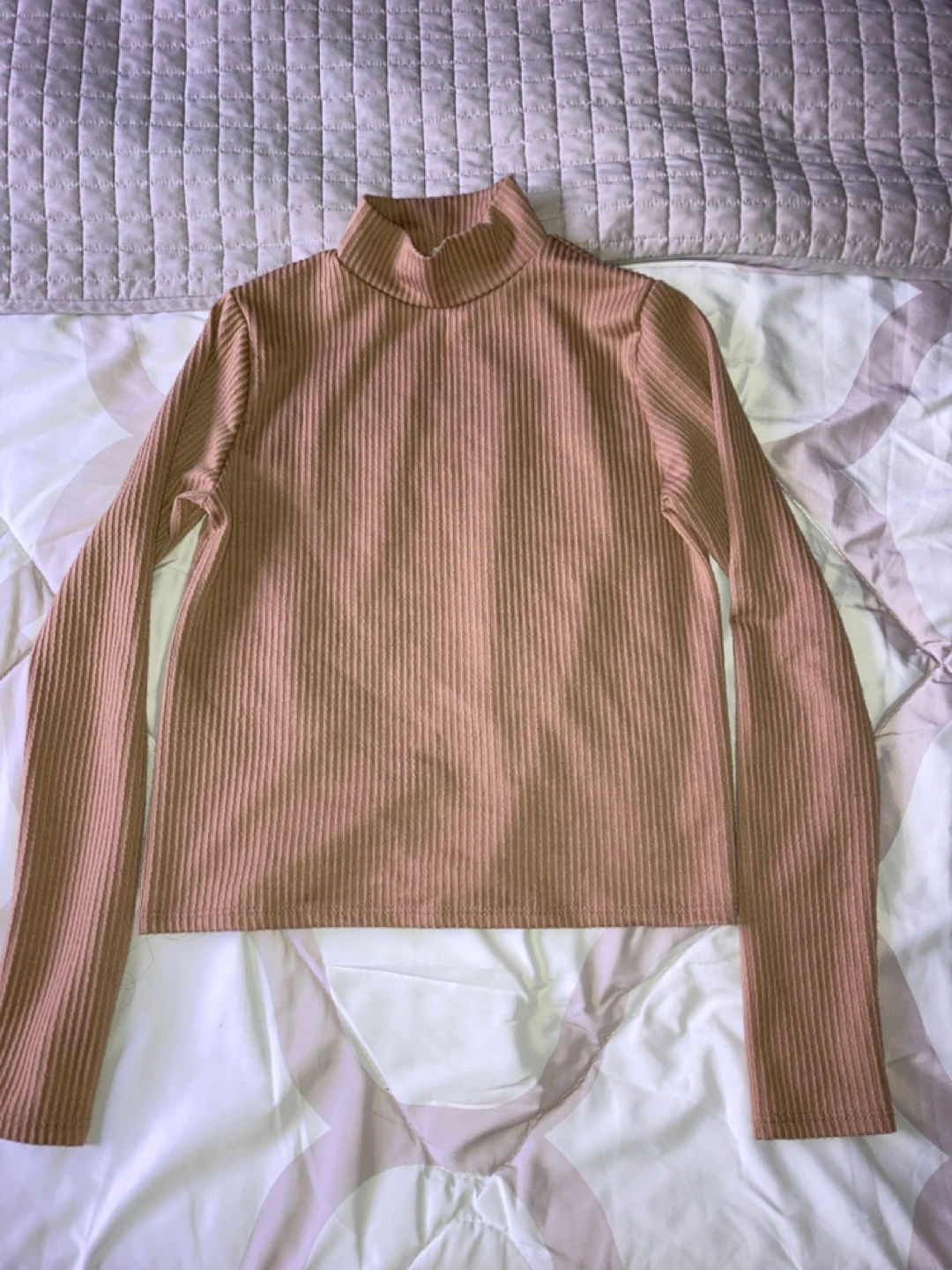31Taupe-coloured mock neck, long sleeve, ribbed top. Close-fitting. Great for layering or wearing alone. Size small