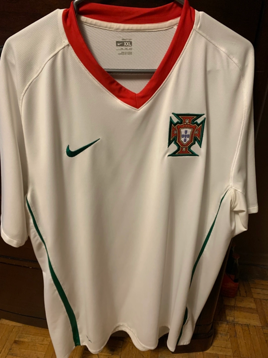 Men's Portugal national football team jersey. Size XXL. White with green and red accents. Nike logo. Great for collectors or fans.
