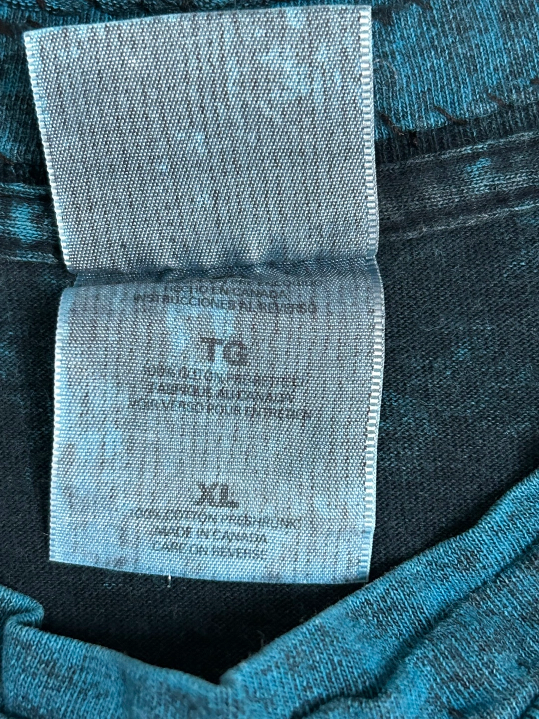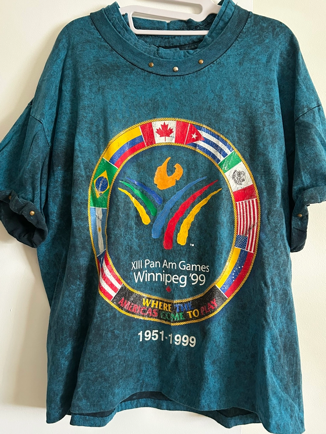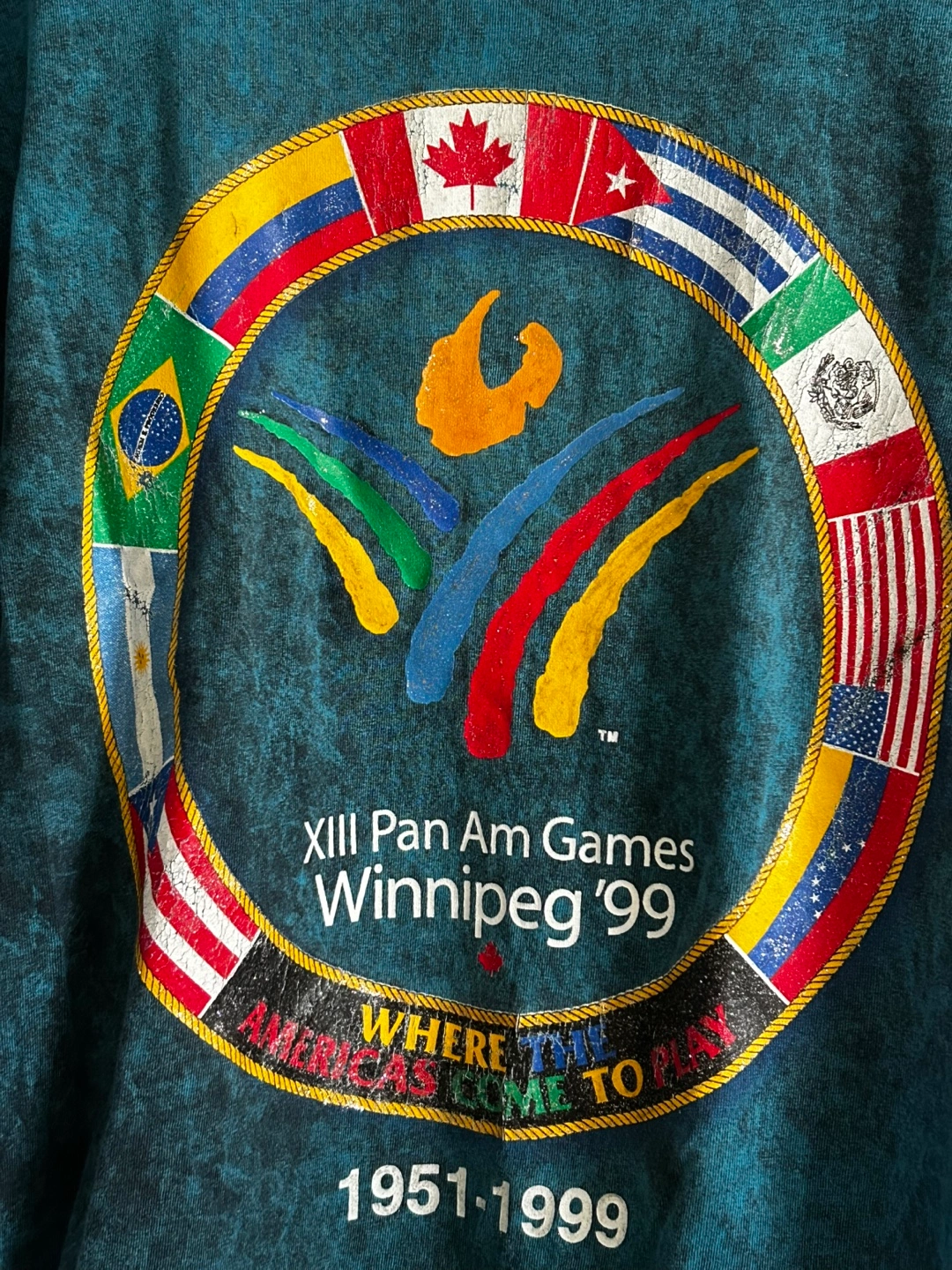 Teal acid wash t-shirt. Features a graphic design celebrating the 1999 Pan American Games in Winnipeg, Manitoba. Includes a list of previous Pan Am Games host cities. Size XL.