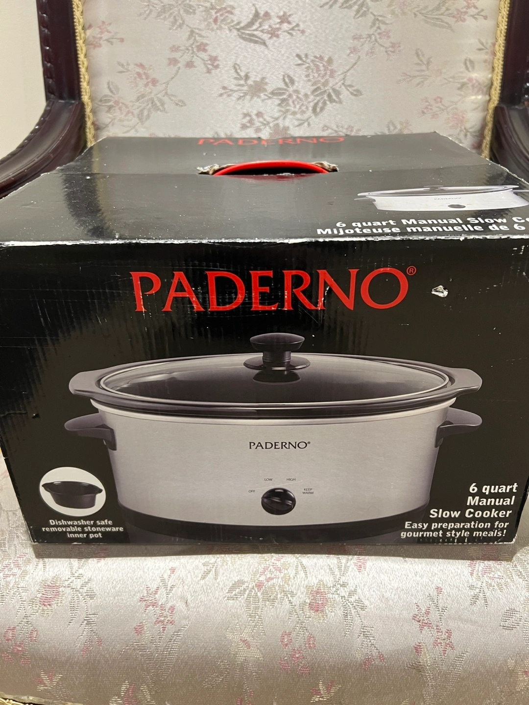 Brand New in box. Six quart capacity. Dishwasher safe stoneware inner pot. Easy preparation for gourmet meals.