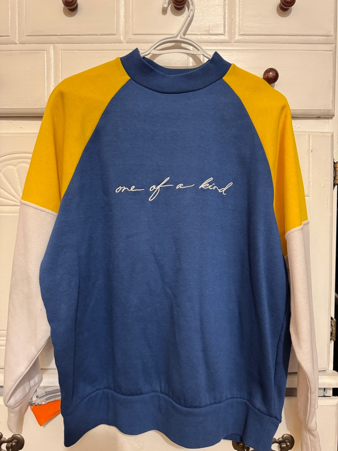 Men's Urban Man sweatshirt. Size small. Blue, yellow and white colour block design. 'One of a kind' embroidered on the front. Long sleeves. Mock