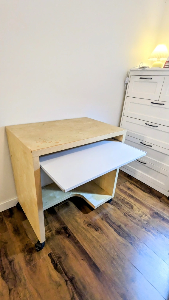 Light beige computer desk. Pull-out keyboard tray. Four caster wheels. Small storage space underneath.