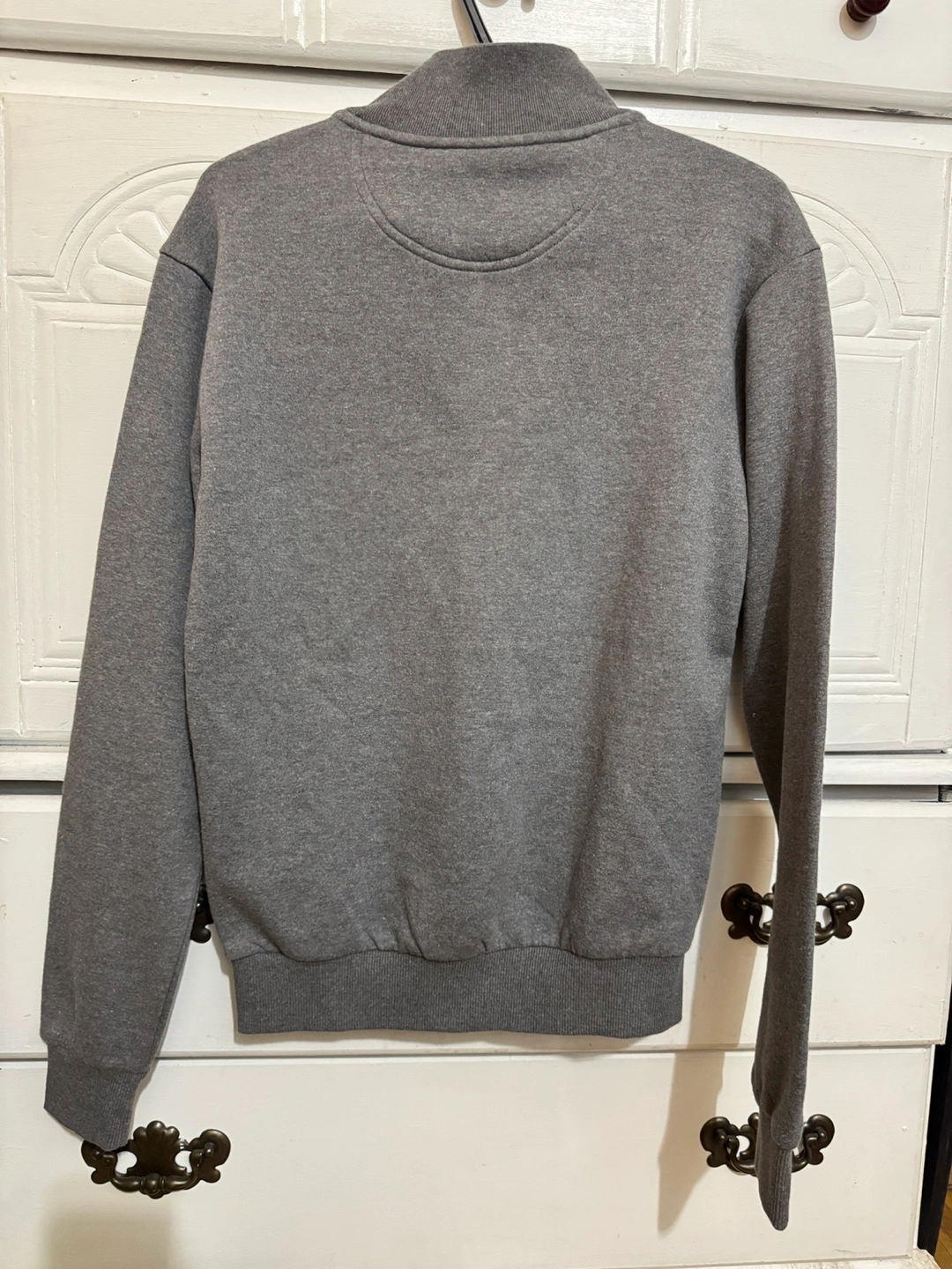 Grey 1/4 zip pullover. Long sleeves. Ribbed cuffs and hem. Small embroidered logo. Size extra small. Made in Pakistan.
