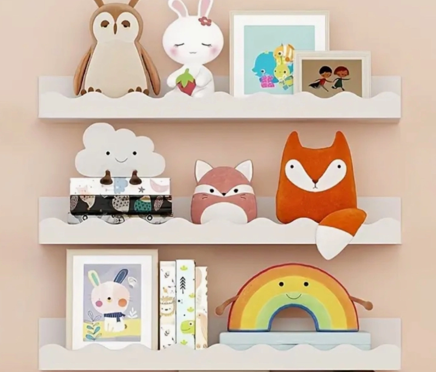 Adorable set of three white floating shelves. Perfect for a child's room. Scalloped edges. Includes mounting hardware. Approximately 16cm , used,