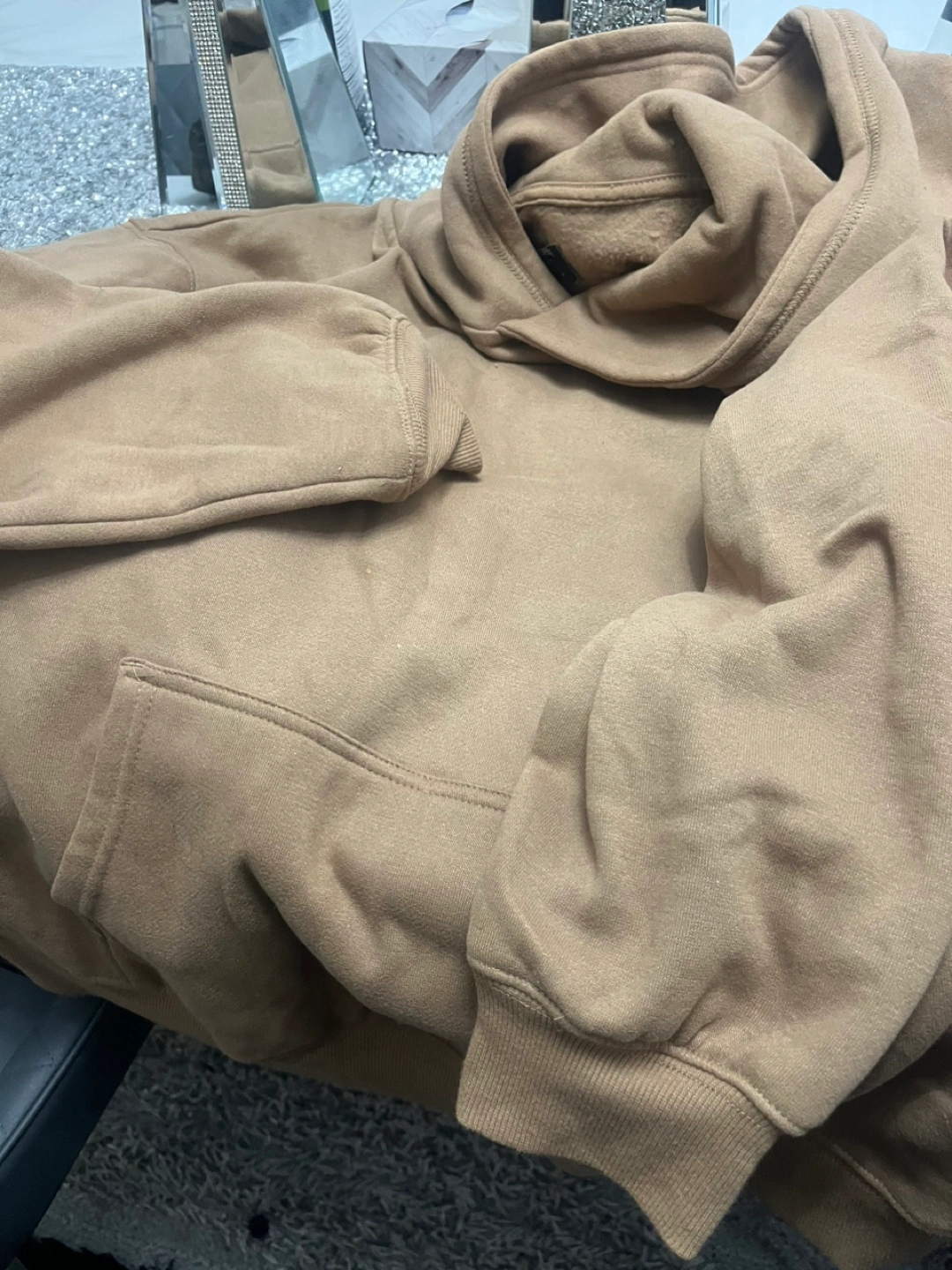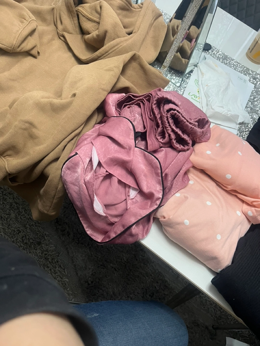 Bundle includes a tan oversized hoodie and a dusty rose coloured pajama set. Pajama set features a satin-like material. Great for lounging or casual wear.