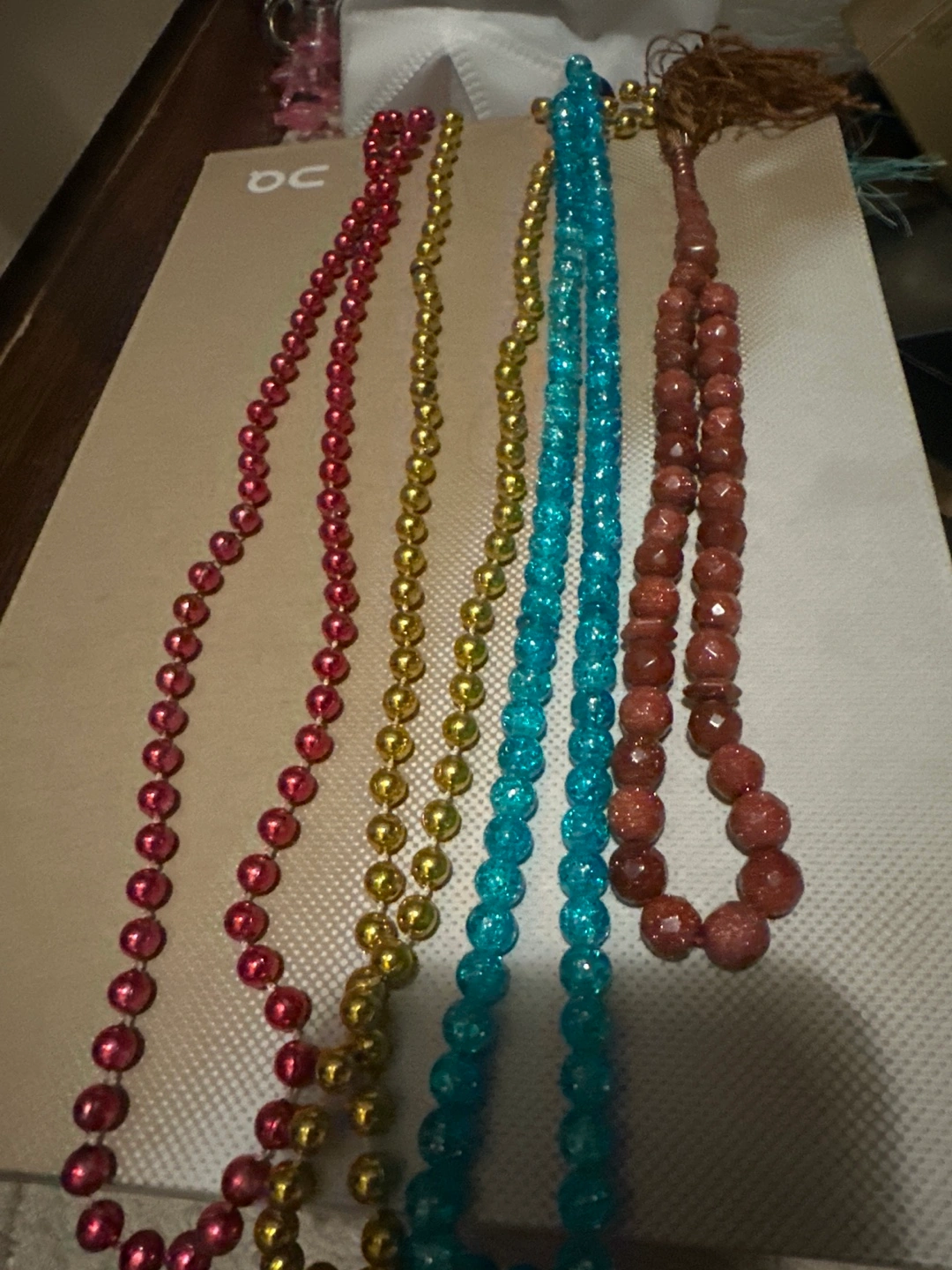Set of four beaded necklaces. Colours include red, gold, teal, and brown. Various bead shapes and sizes.