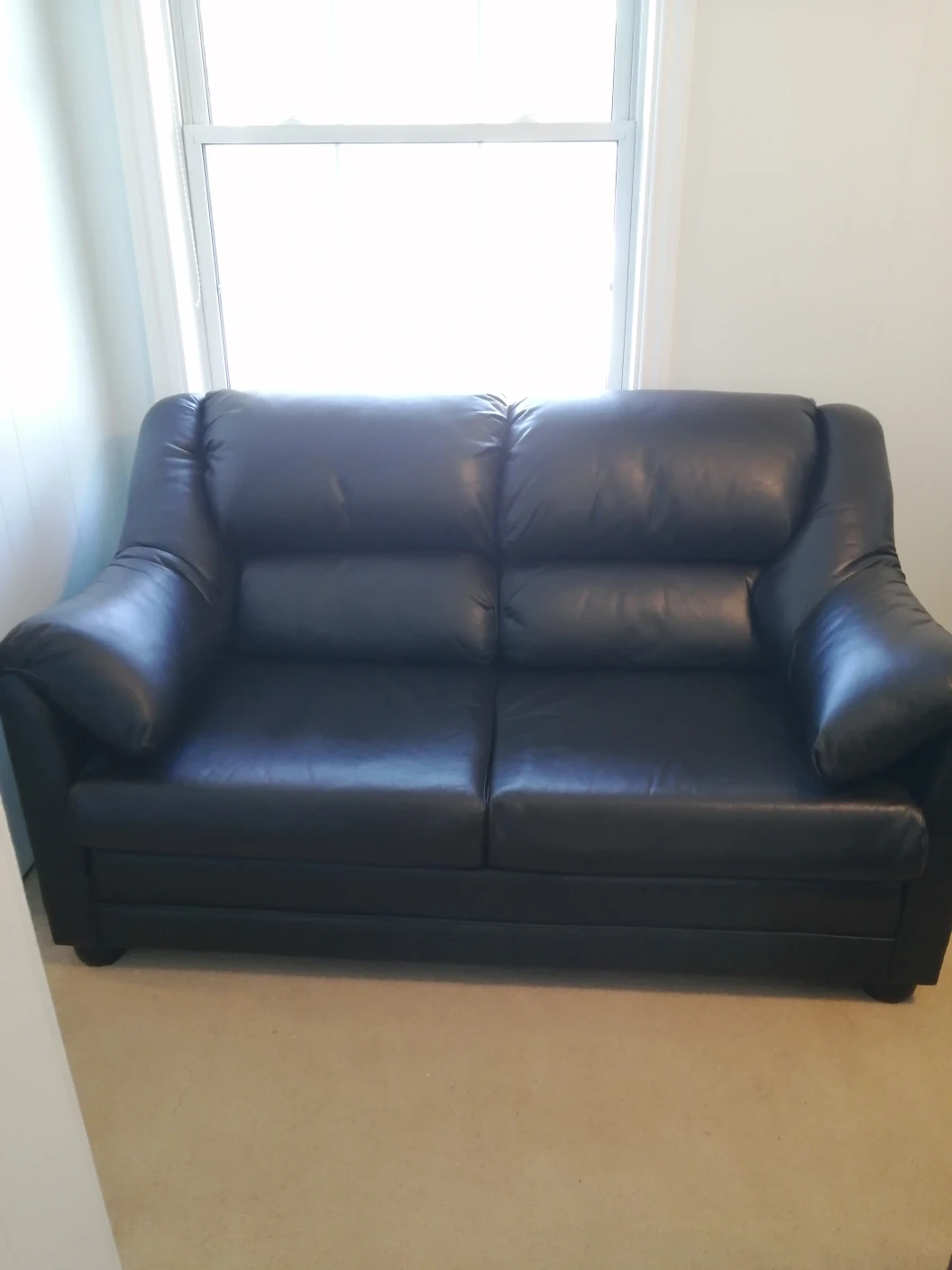 Excellent condition. Comfortable black leather loveseat. Two-seater. Curved armrests. Good condition. Comes from a smoke and pet free home Pick up only. Must be able to load yourself.