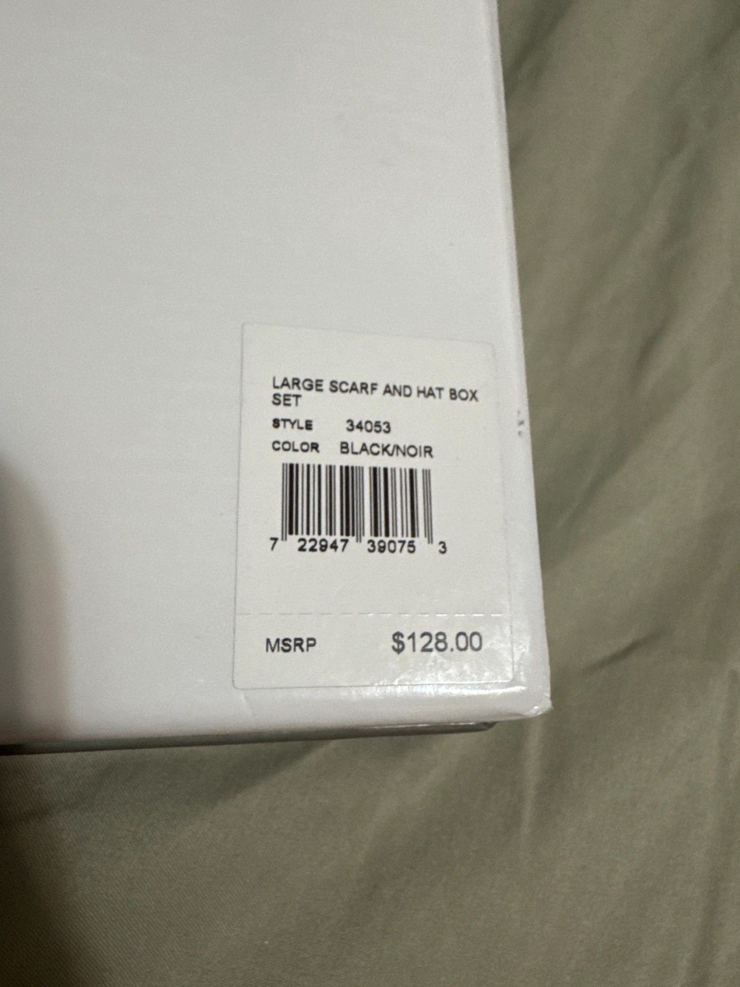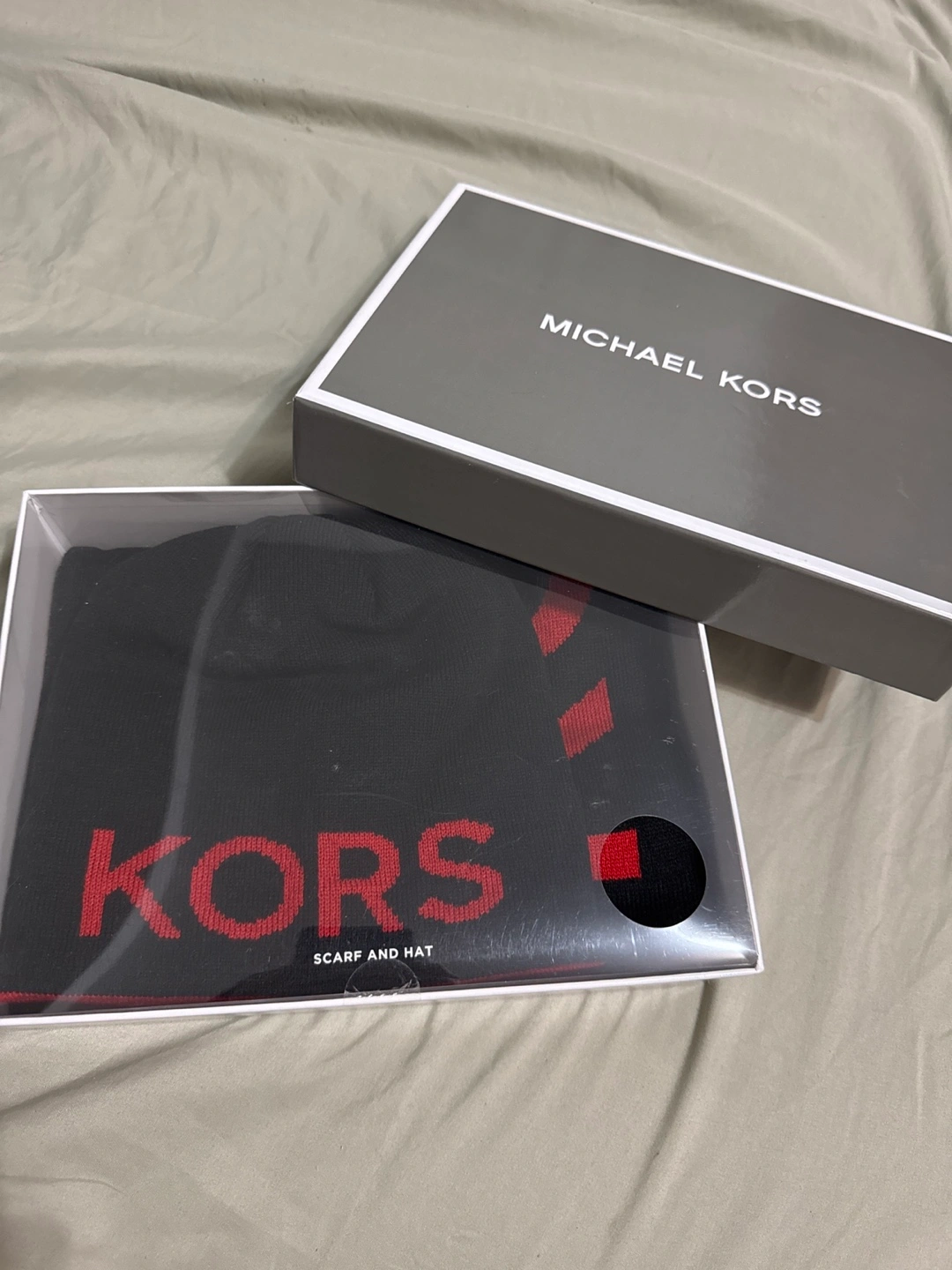 New with tags, Michael Kors scarf and hat set. Black with red detailing. Large size. Comes in original box.