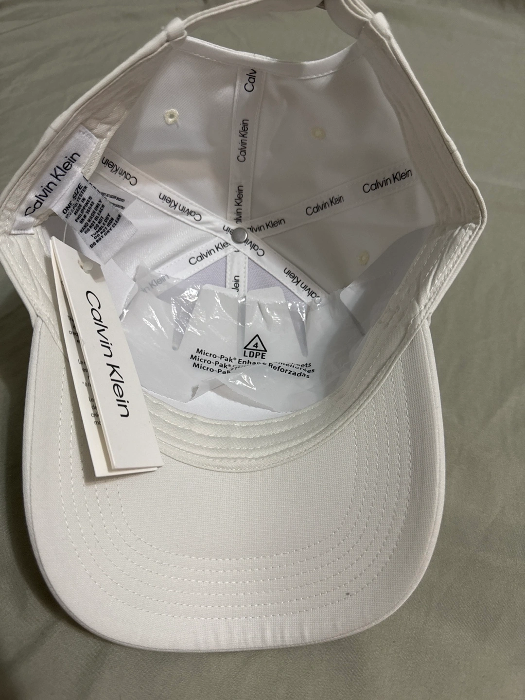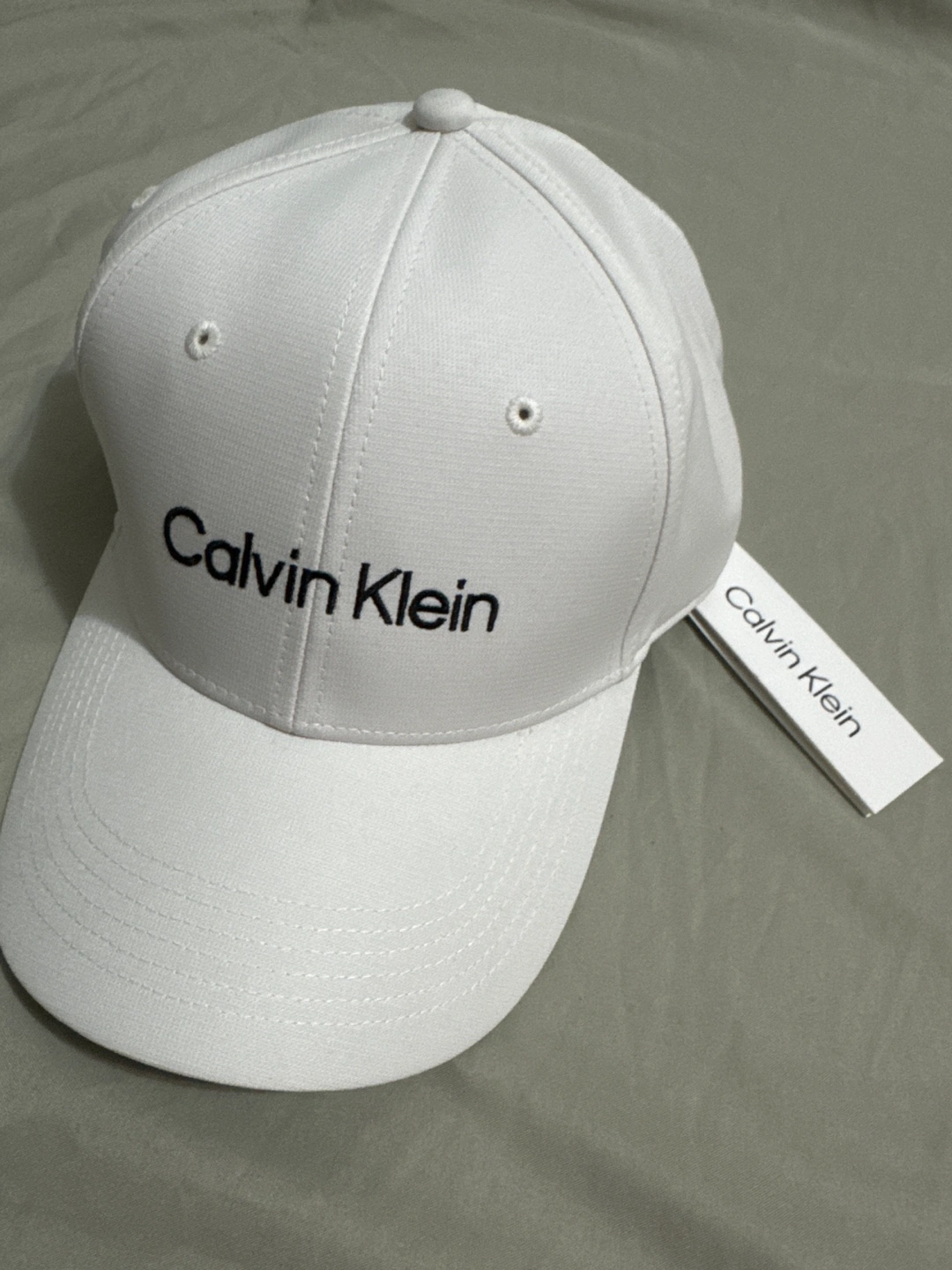 Classic white baseball cap. Features embroidered Calvin Klein logo. Adjustable sizing. New with tags.