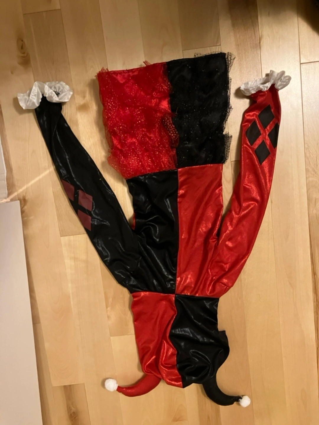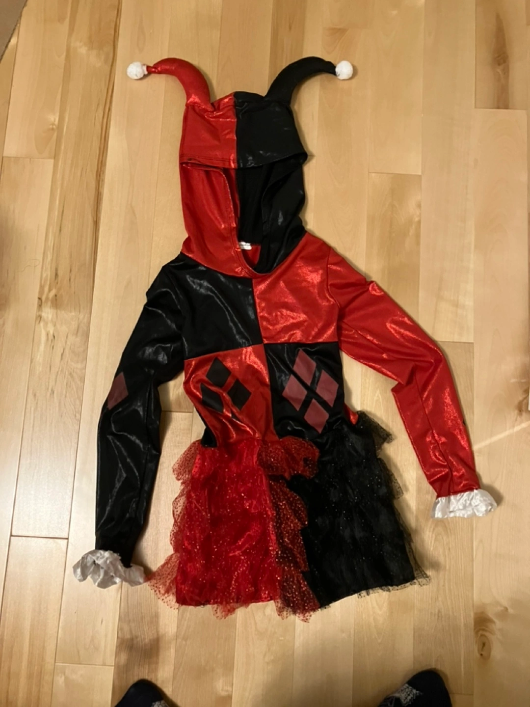 Red and black hooded costume dress. Features a harlequin design, long sleeves, and a short ruffled skirt. Great for Halloween or cosplay.