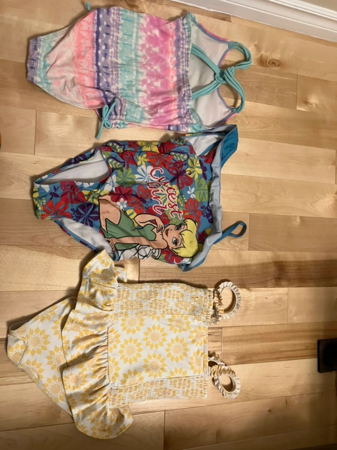 Bundle of three girls' swimsuits. Various colours and patterns. One features Tinkerbell. Another has a sunflower design. The third is tie-dye. Good condition.