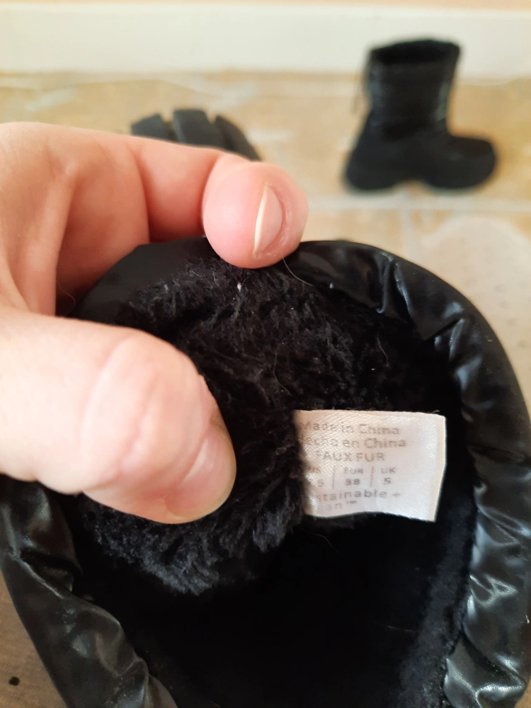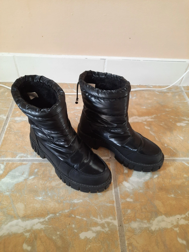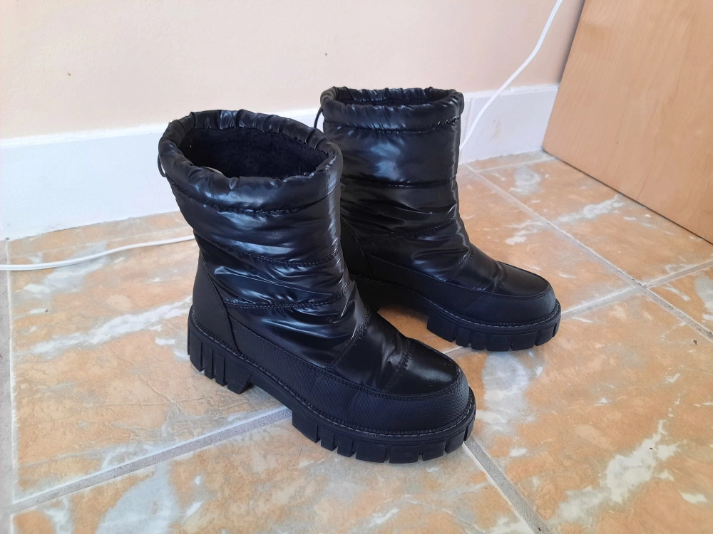 Women's black puffer boots with a chunky sole. The boots have a pull tab at the back and a drawstring at the top of the shaft. They have a warm, fleece lining. The boots have been worn but are in good condition.