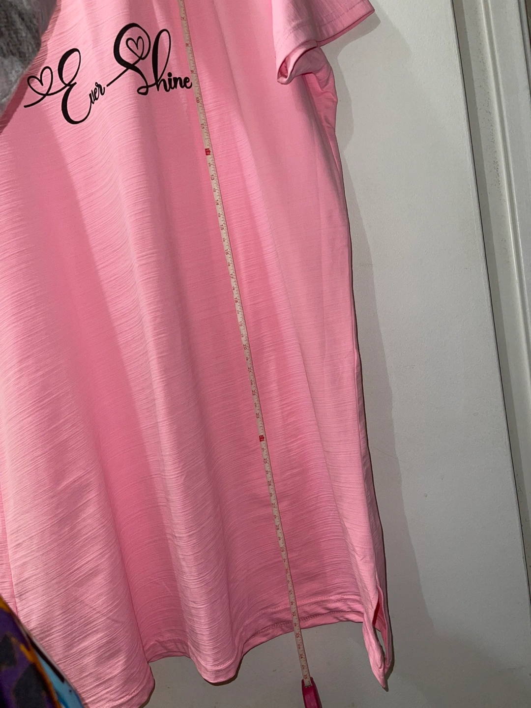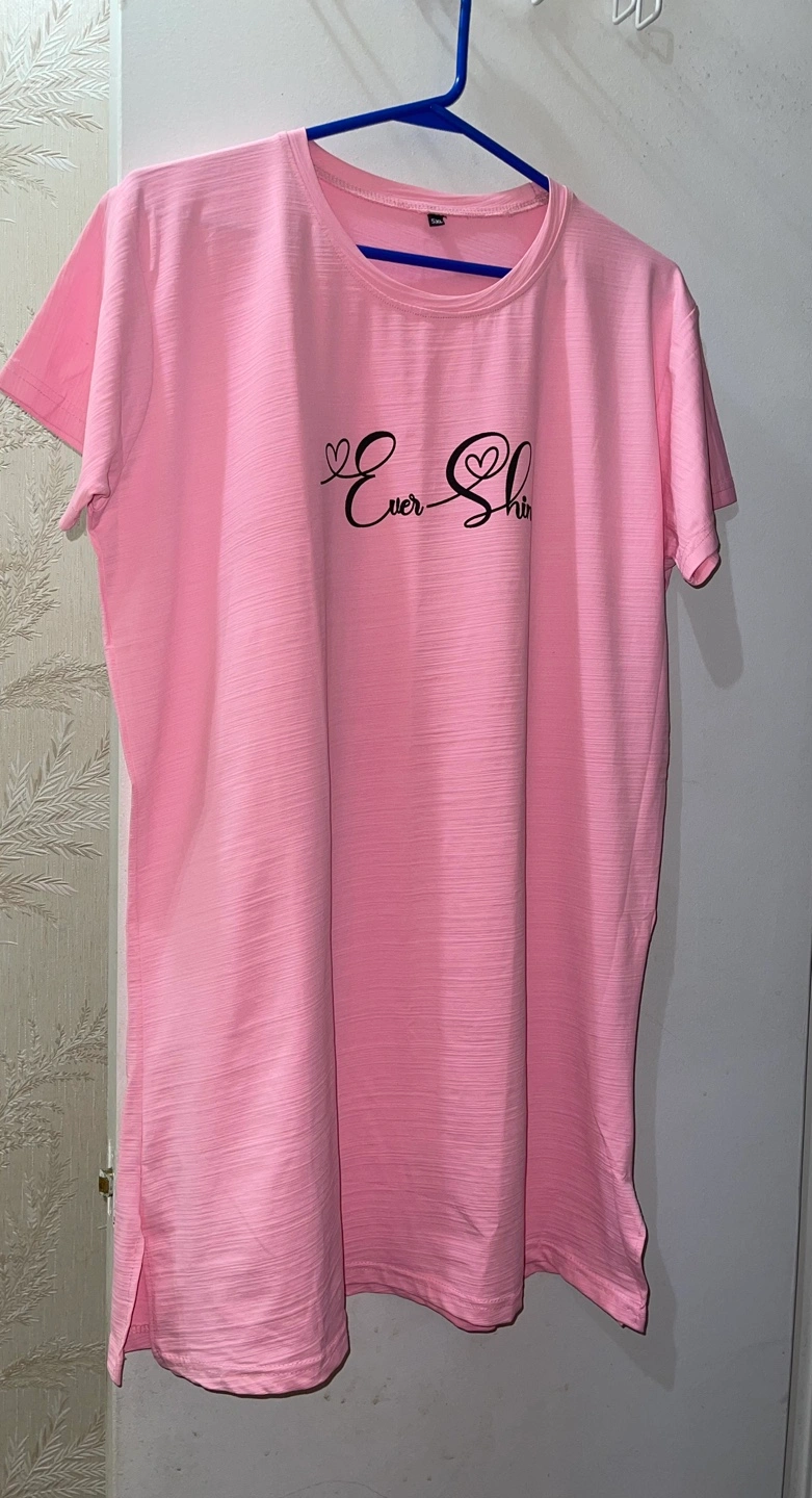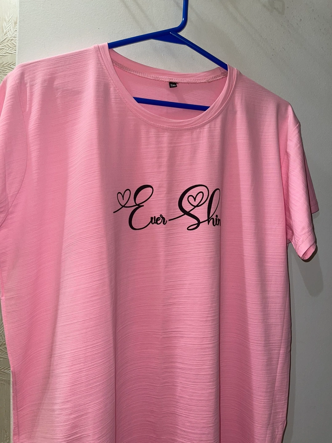 Women's pink t-shirt. Features short sleeves and a round neckline. 'Ever-Shine' graphic printed on the front. Size XL