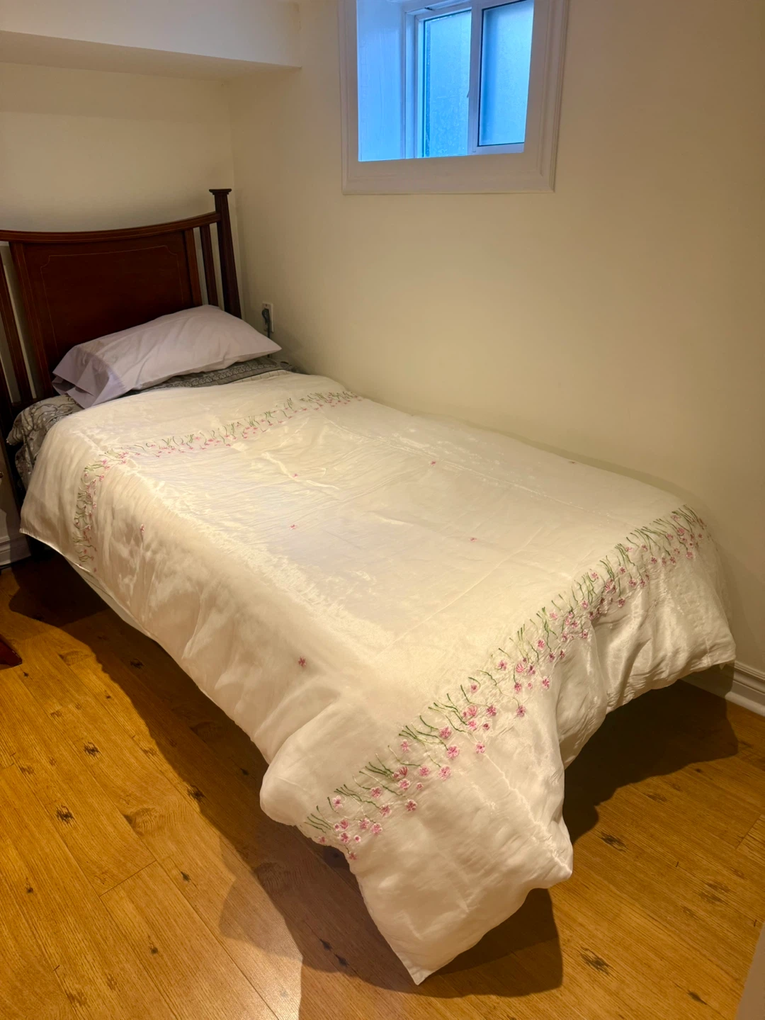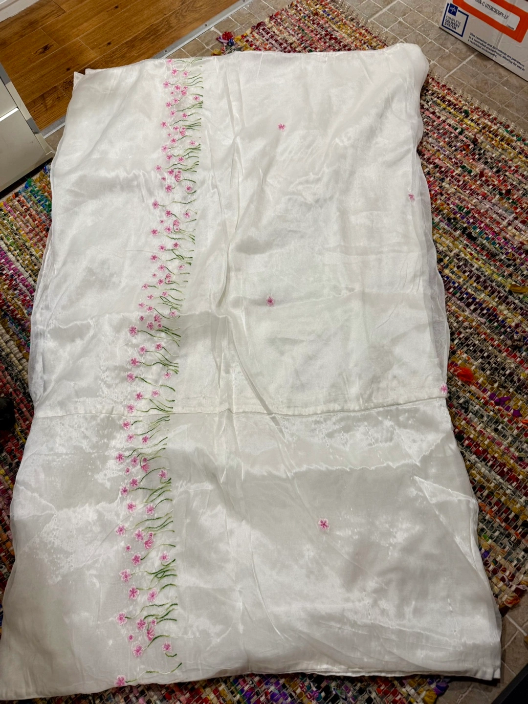 Twin Duvet cover, slightly used. White Sheer with pink embroidered flowers (with lining). Adorable for girl’s bedroom.