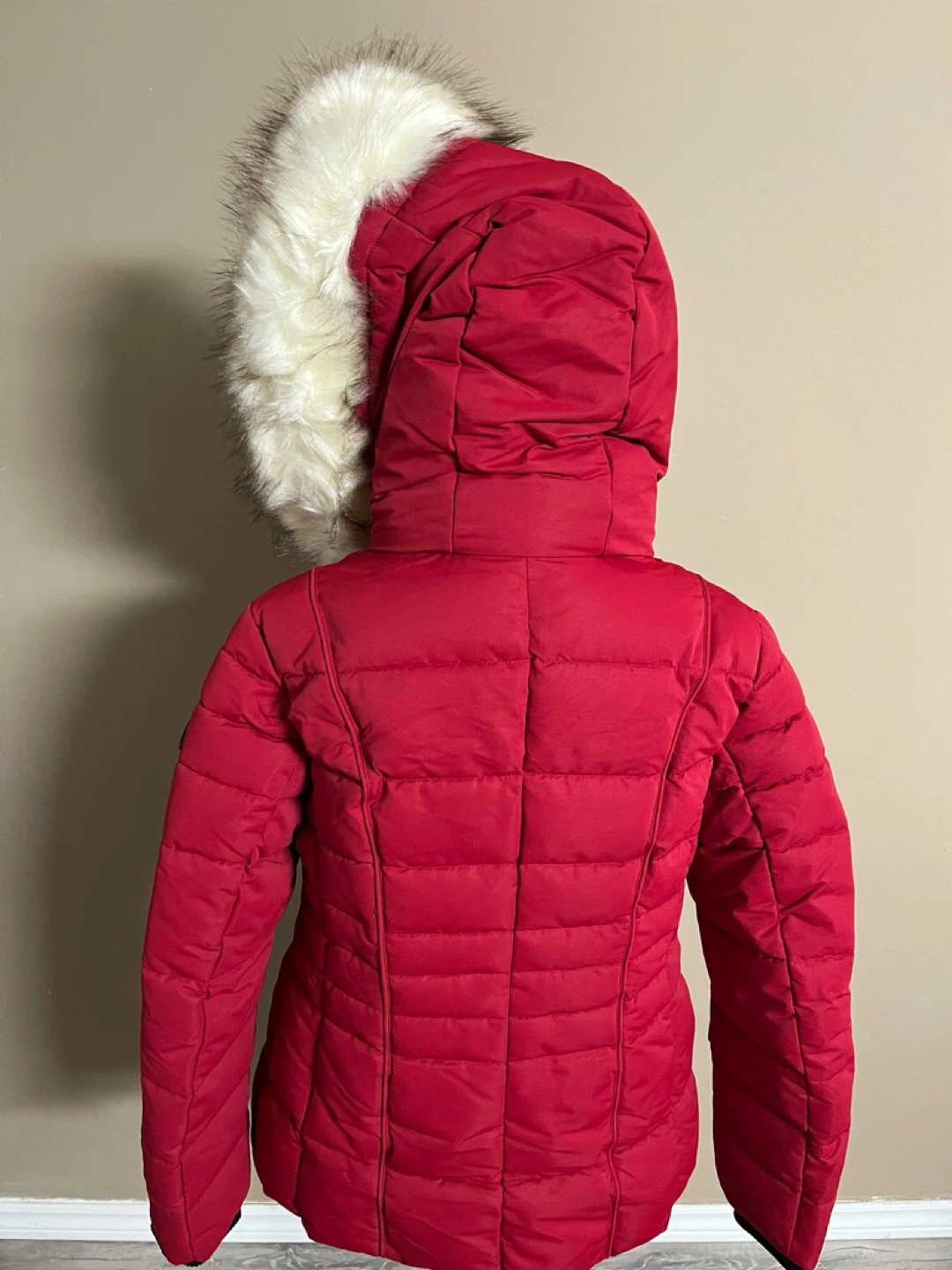 Women's red puffer jacket. Features a faux fur lined hood and zipper closure. Long sleeves with ribbed cuffs. Side pockets with zippers.