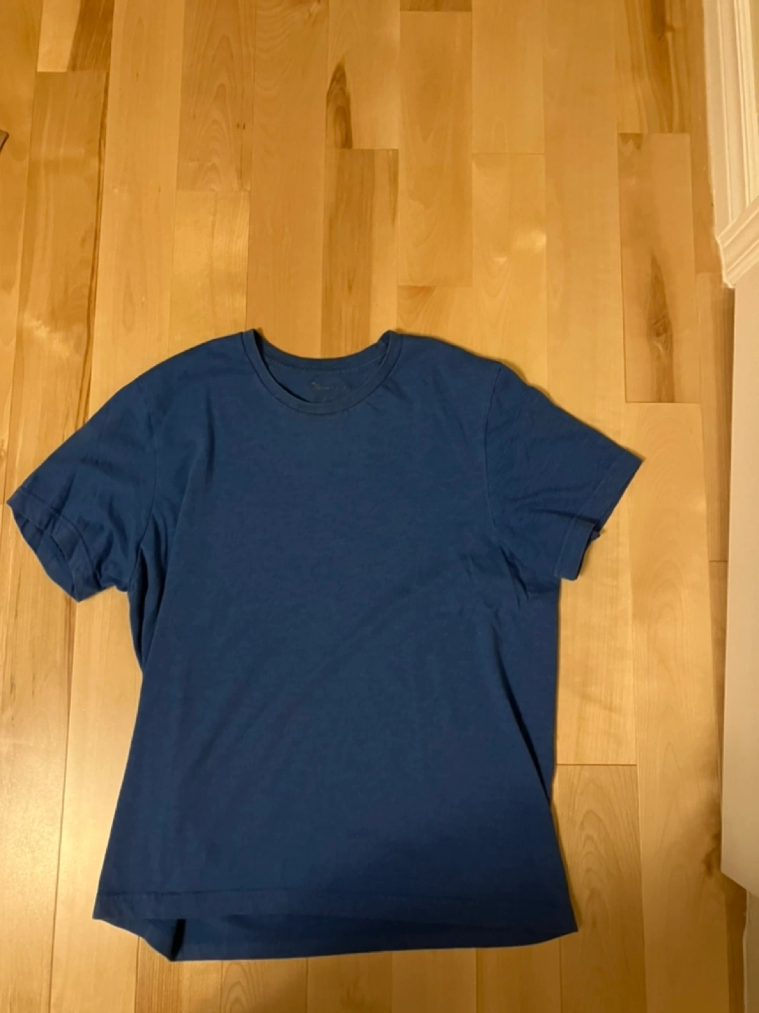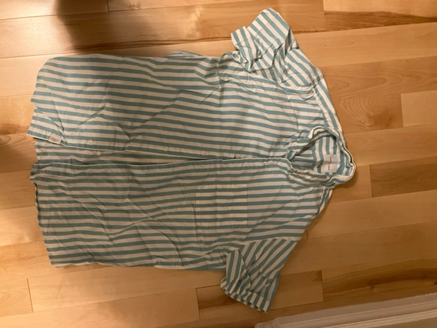 Bundle includes three men's shirts: a blue and white striped short-sleeve button-up, a grey and white striped long-sleeve thermal, and a solid blue short-sleeve crew neck t-shirt. Sizes vary. Great for layering or wearing separately.