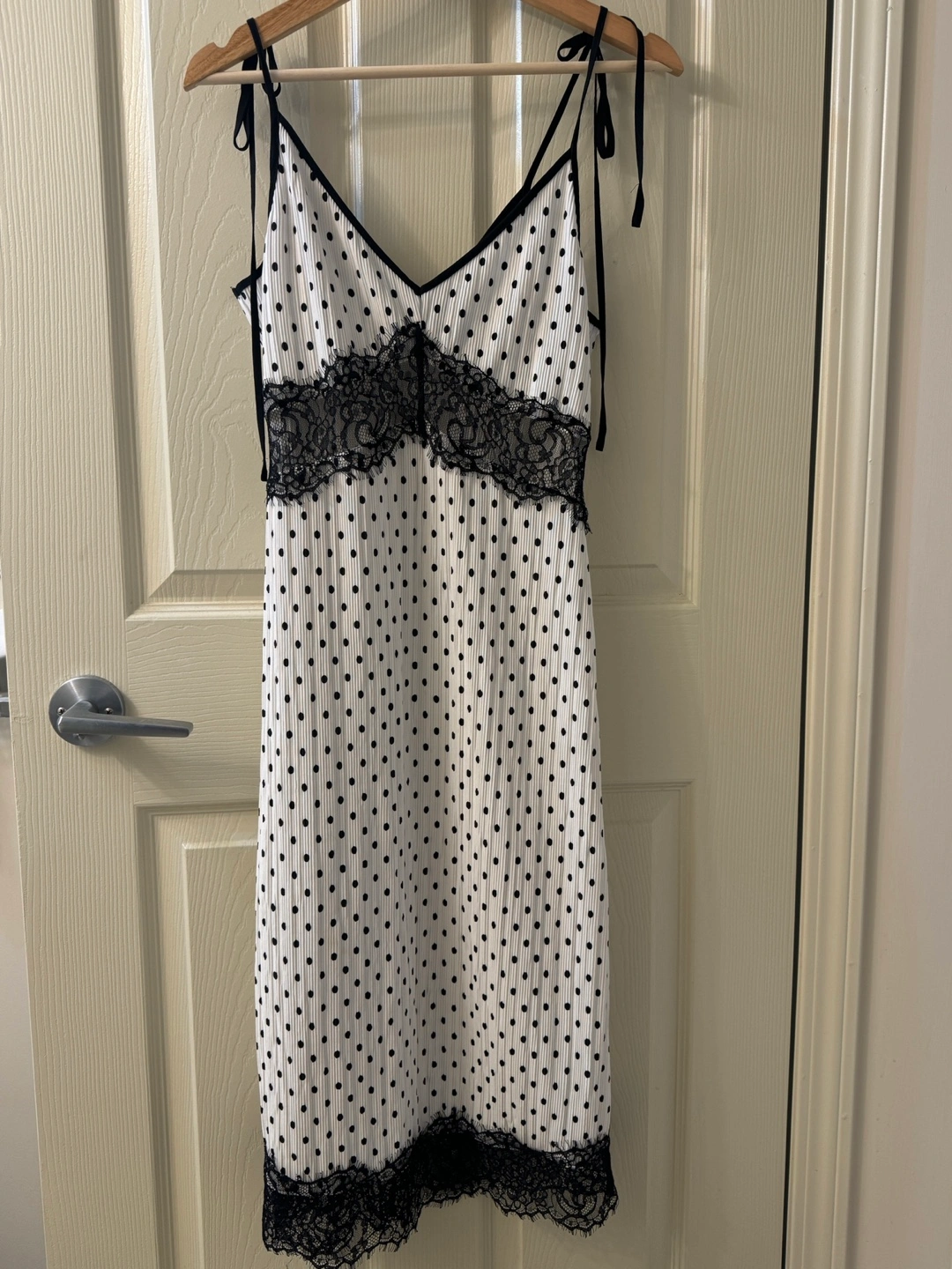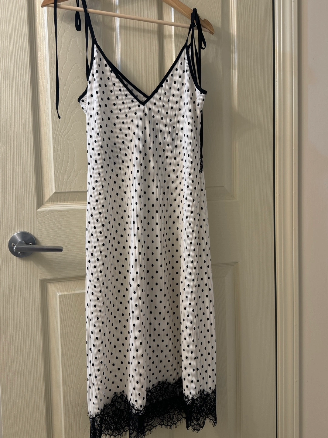 Beautiful midi slip dress. Features thin straps, a V-neckline, and black polka dots on a white background. Black lace trim accents the neckline and hem. Perfect for a summer event or a night out.