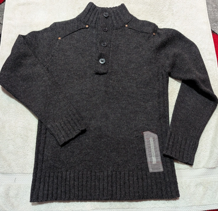 150Men's charcoal grey knit sweater. Size Medium. Features a mock neck, button placket, and unique shoulder detailing. Long sleeves. Good condition. Open to good offers. Have yourself a good day