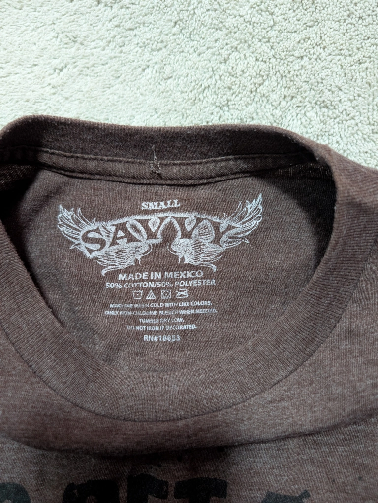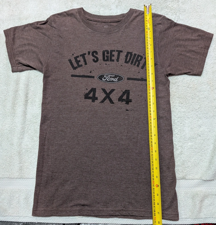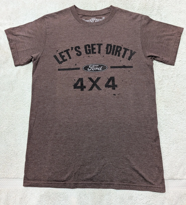 Brown short sleeve graphic tee. Features a Ford 4x4 logo and 'Let's Get Dirty' text. Small size. 50% cotton, 50% polyester. Made in Mexico.