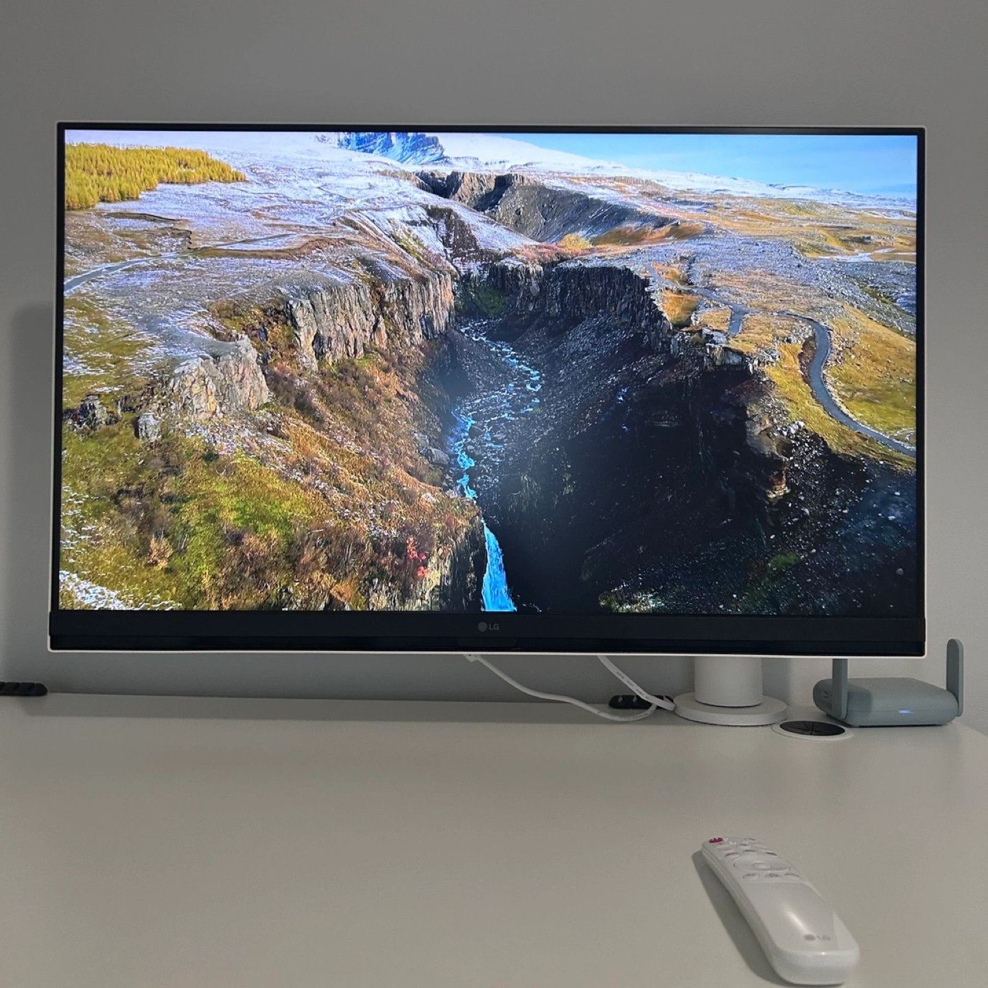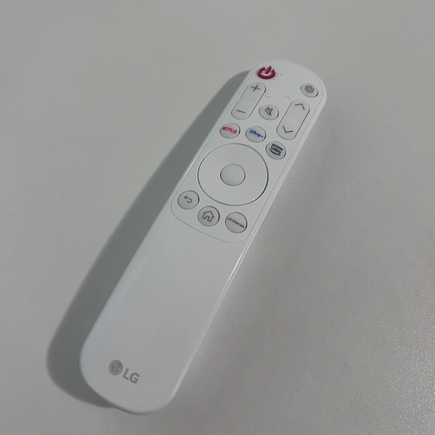 LG smart TV remote. White. Netflix, Disney+, Prime Video buttons. Works with LG smart TVs. Good condition.