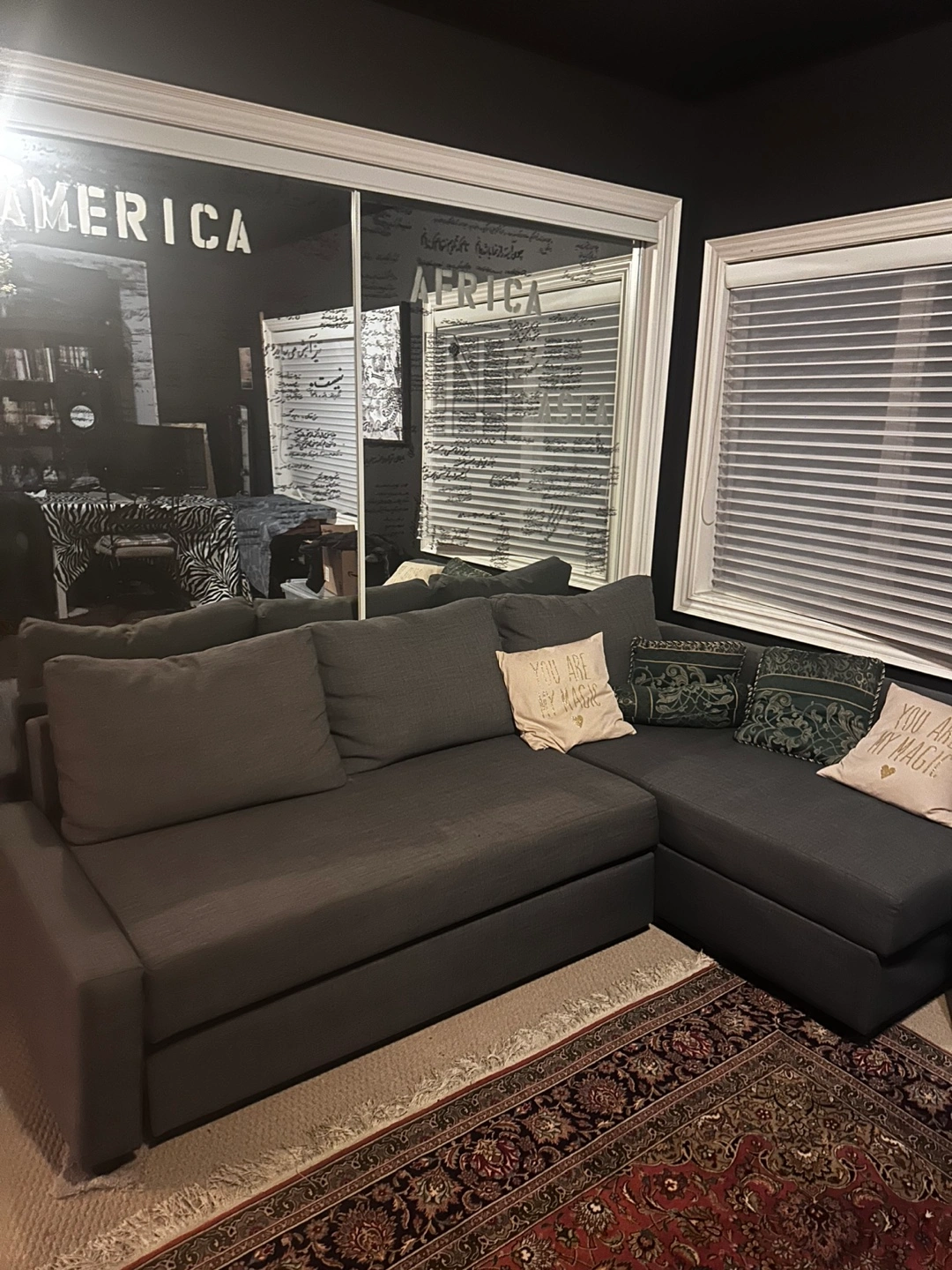 Comfortable and stylish corner sofa bed. Pull-out bed. Dark grey fabric. Includes throw pillows. Excellent for small spaces. proceeds go to charity !