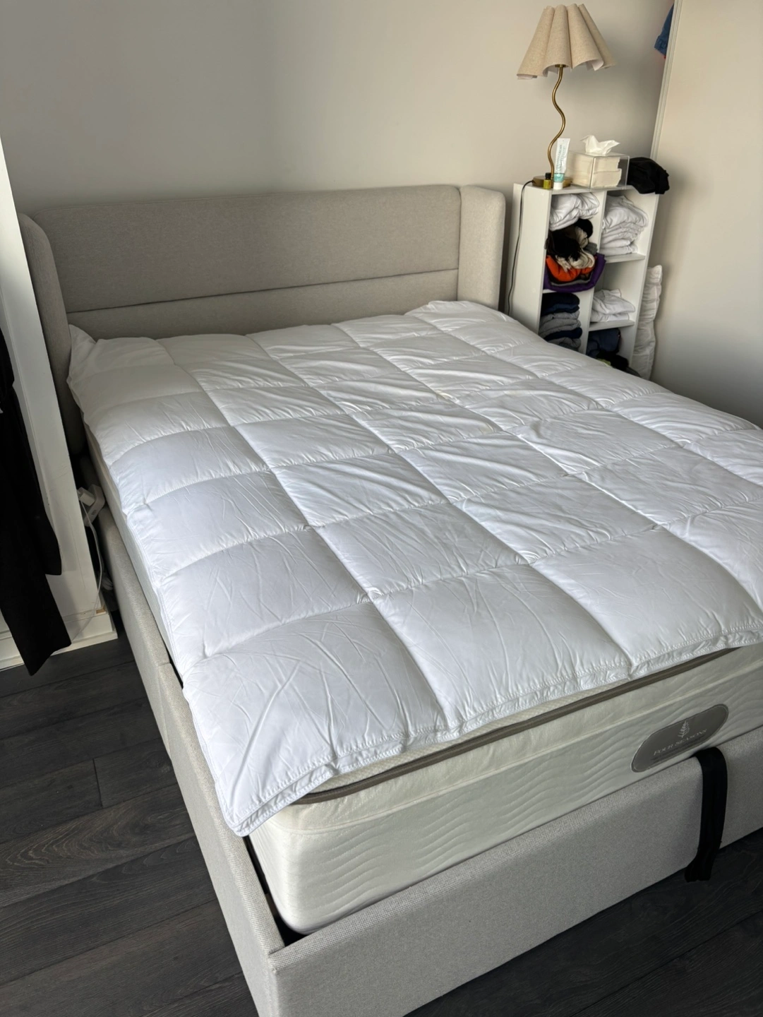 Off white fabric upholstered queen-size platform bed frame. Features integrated under-bed storage with a lift system.