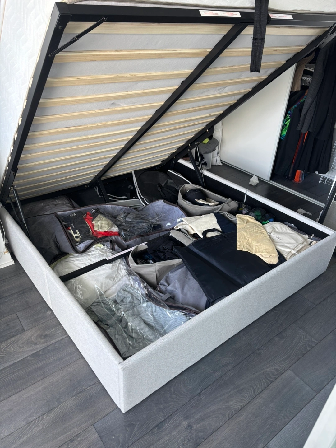 Queen bed frame with lift system for storage