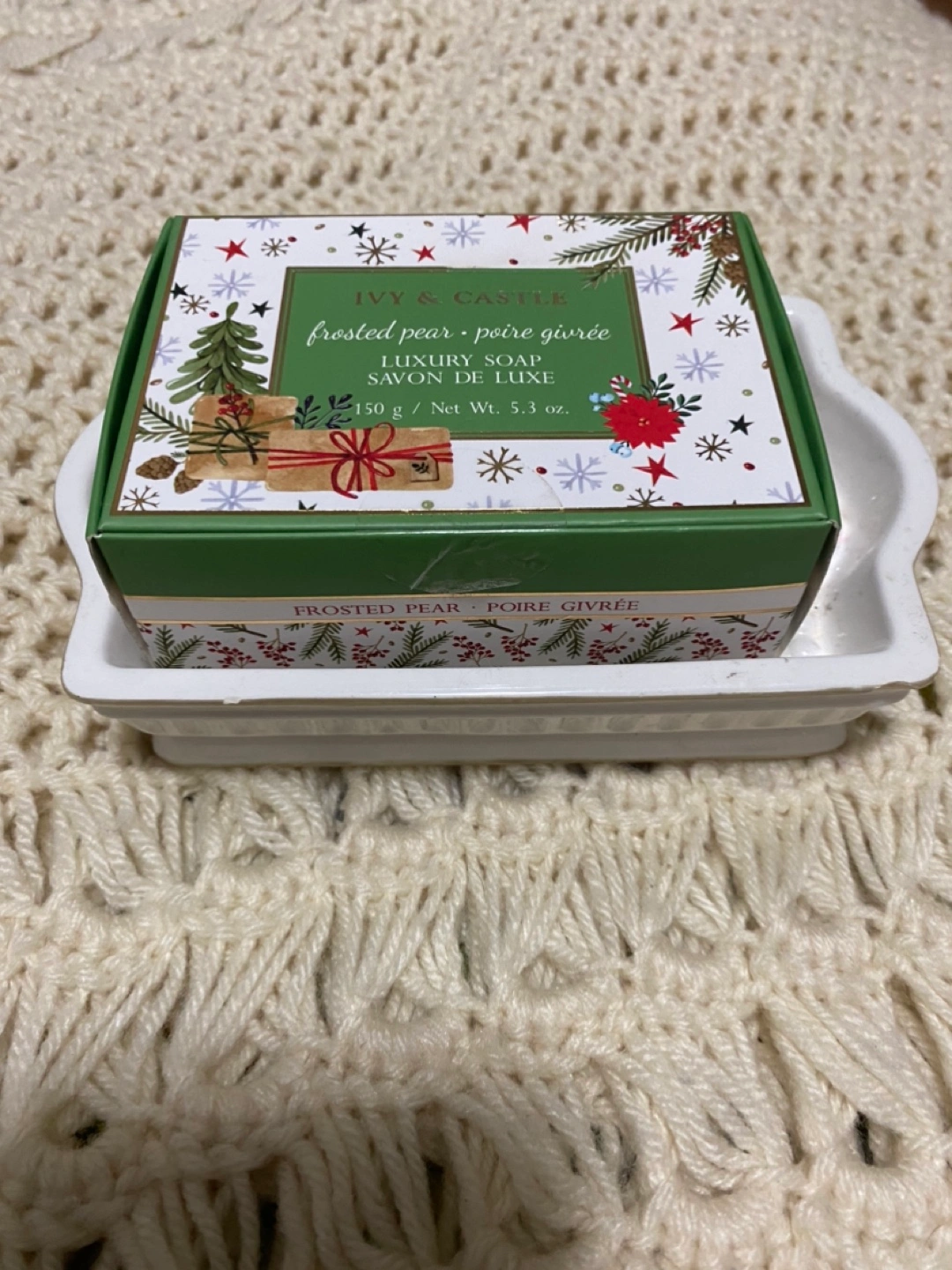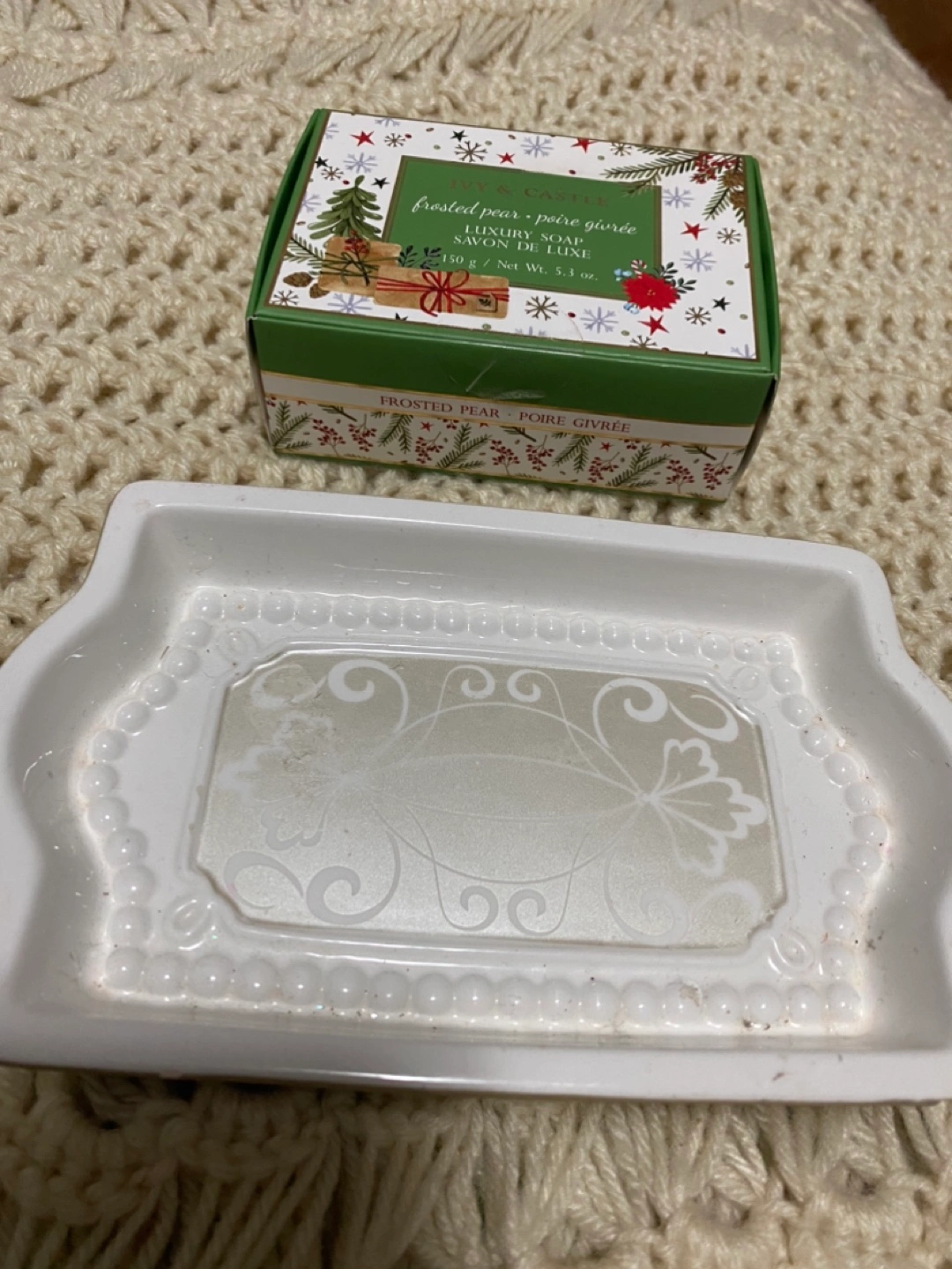 Luxury soap in a festive box. Frosted pear scent. Includes a decorative soap dish. Perfect gift or for personal use. $5 for both!