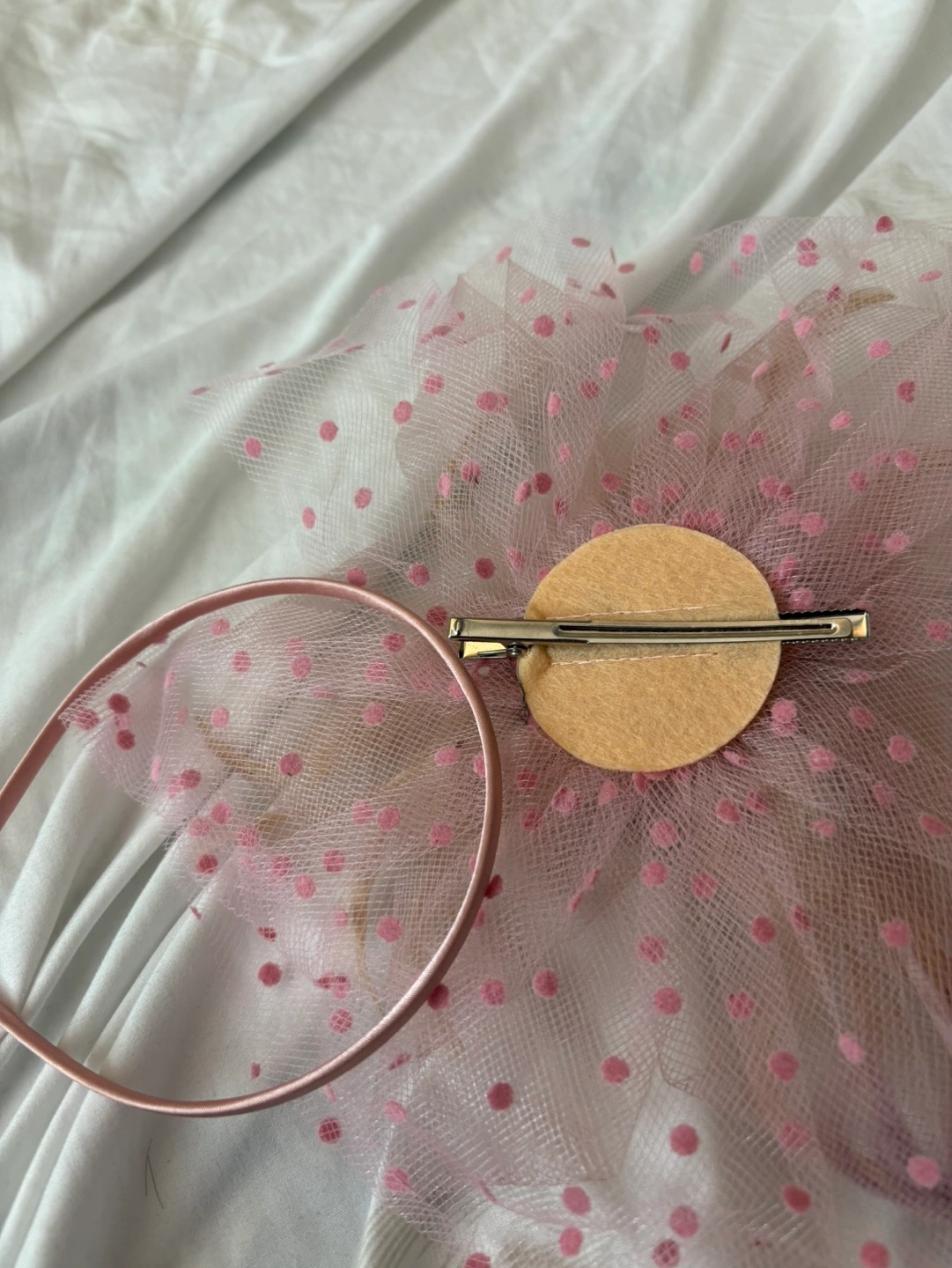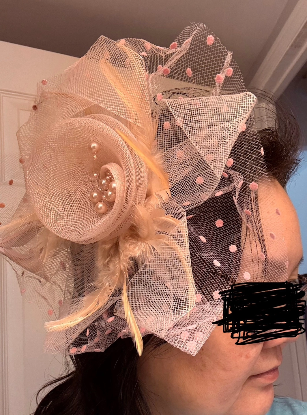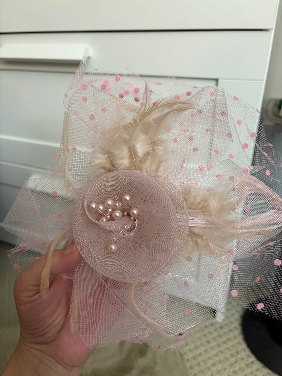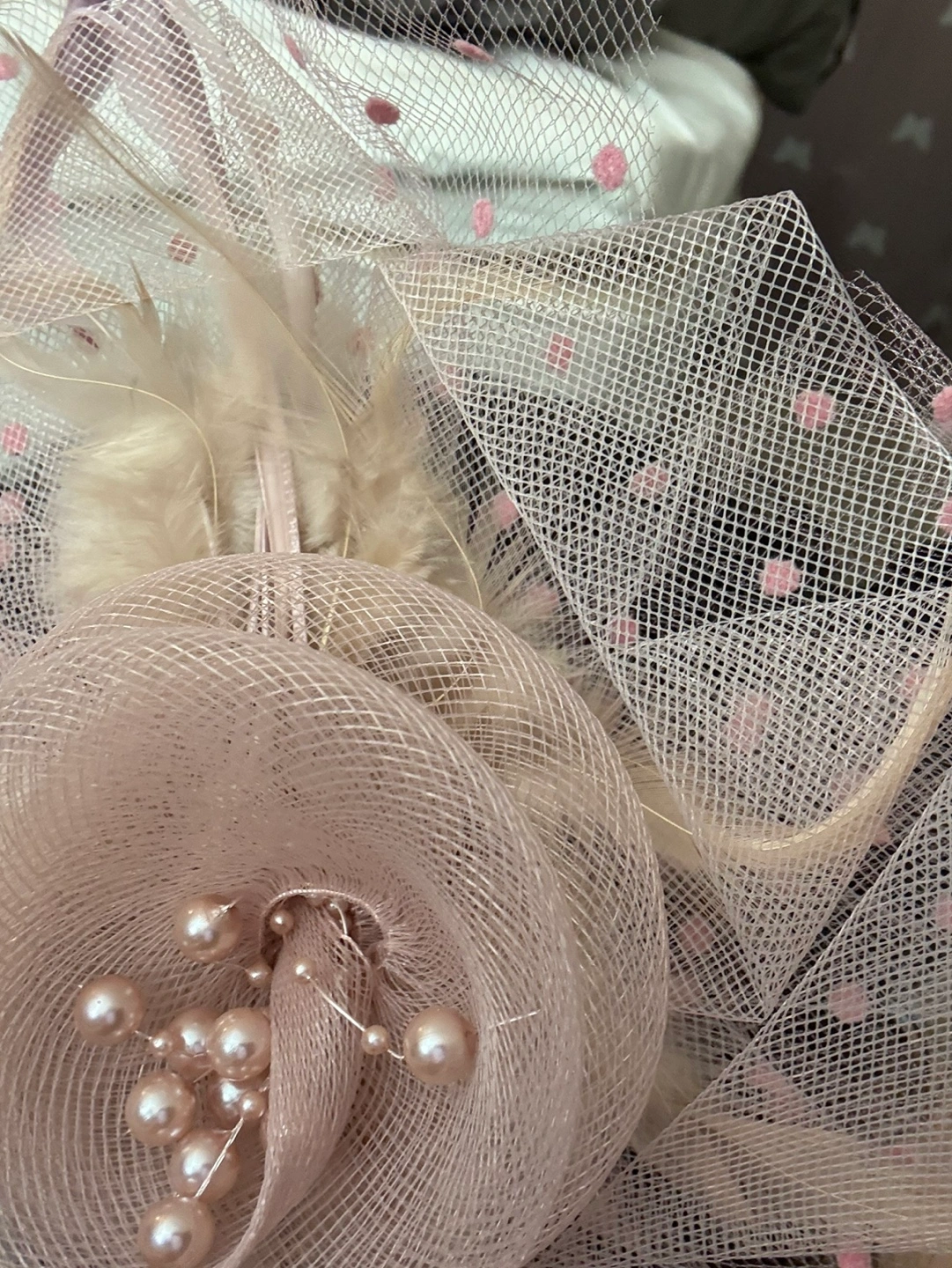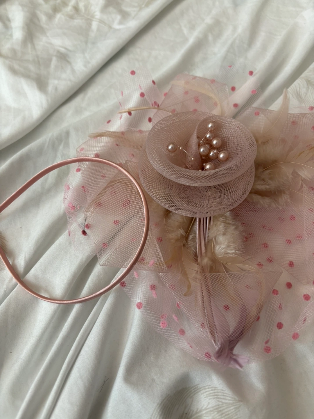 936New new new .Beautiful blush pink fascinator. Features pink polka dot netting, beige feathers, and pearl accents. Includes a matching headband. Perfect for weddings or special occasions.