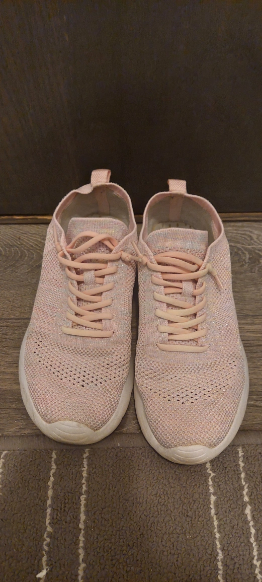 Pair of lightly used pink knit running shoes. Lace-up closure. Soft and comfortable. Great for casual wear or light exercise.