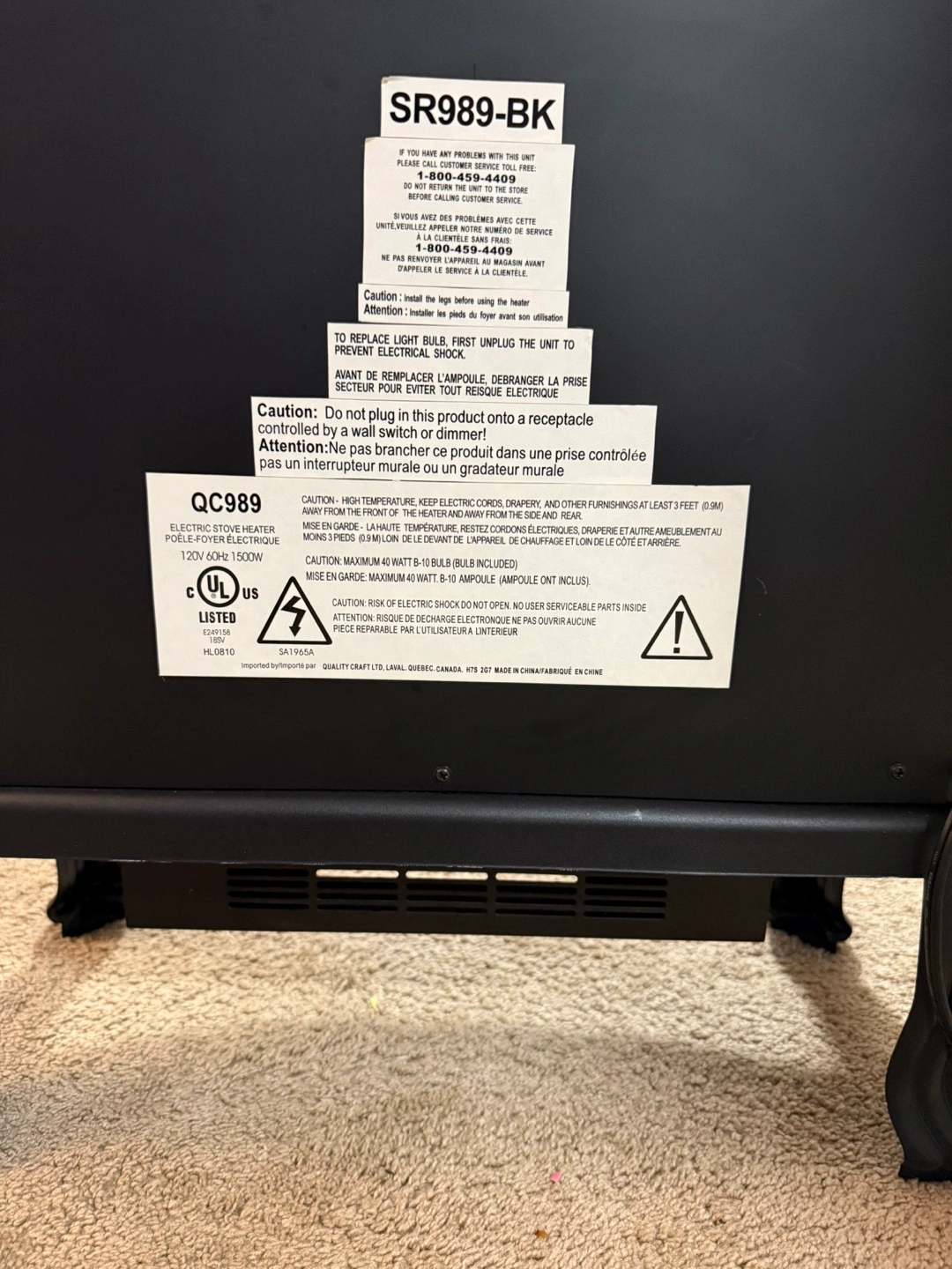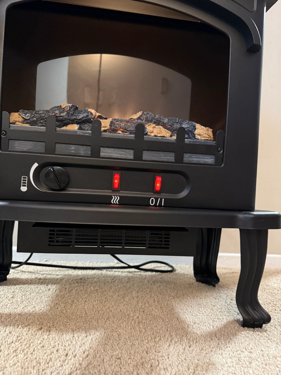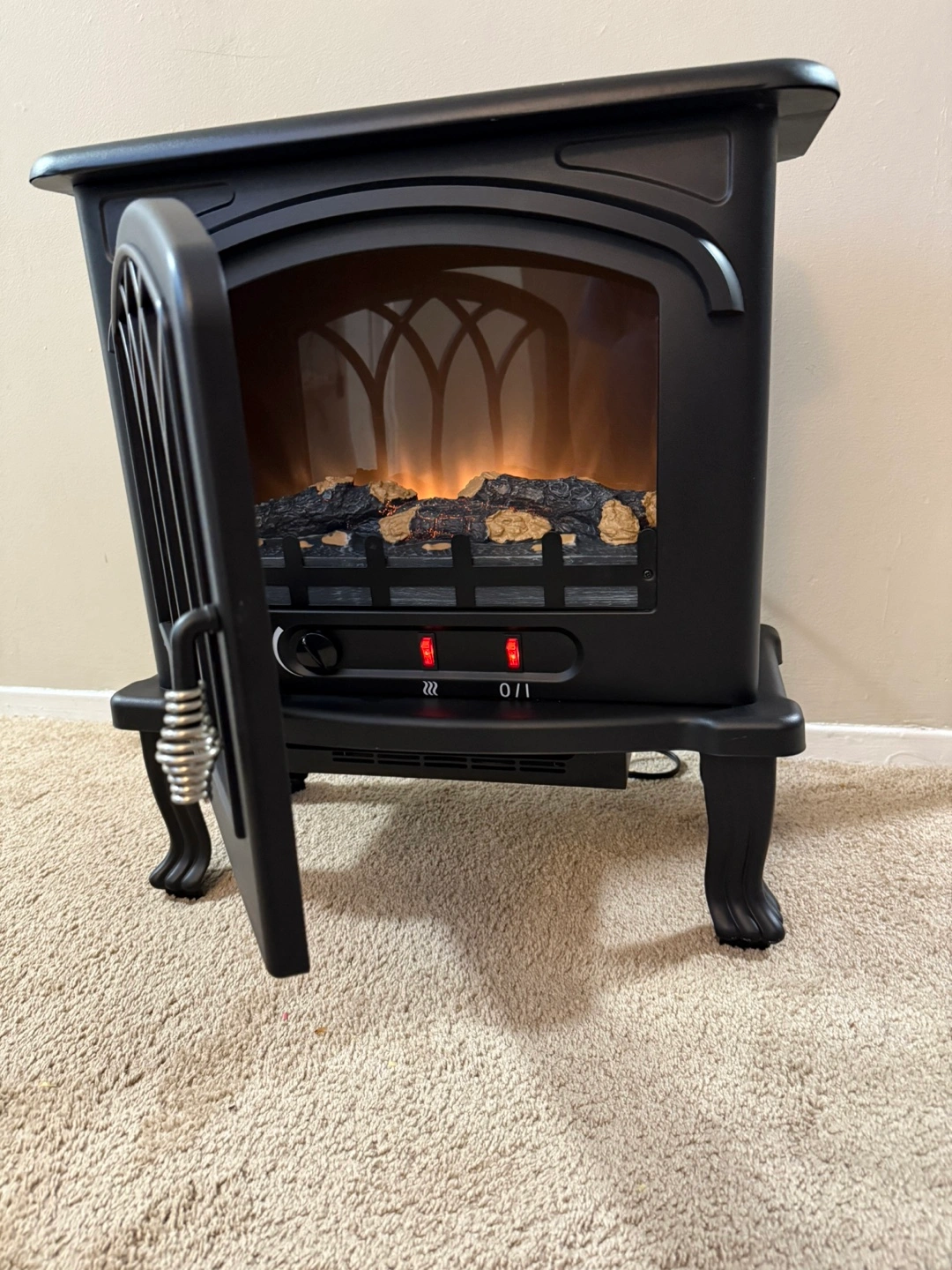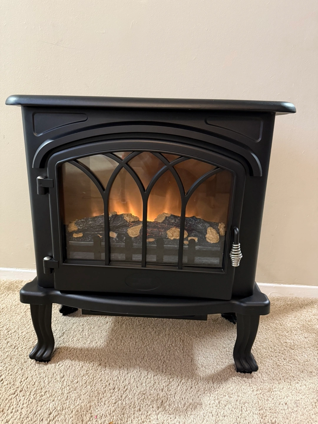 Black electric fireplace. Features realistic flame effect. Good condition.