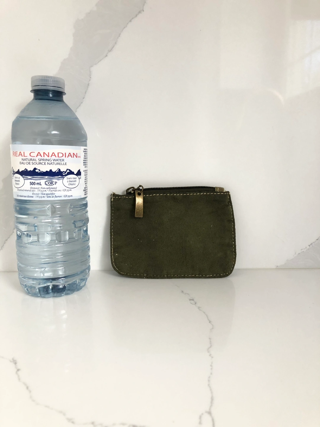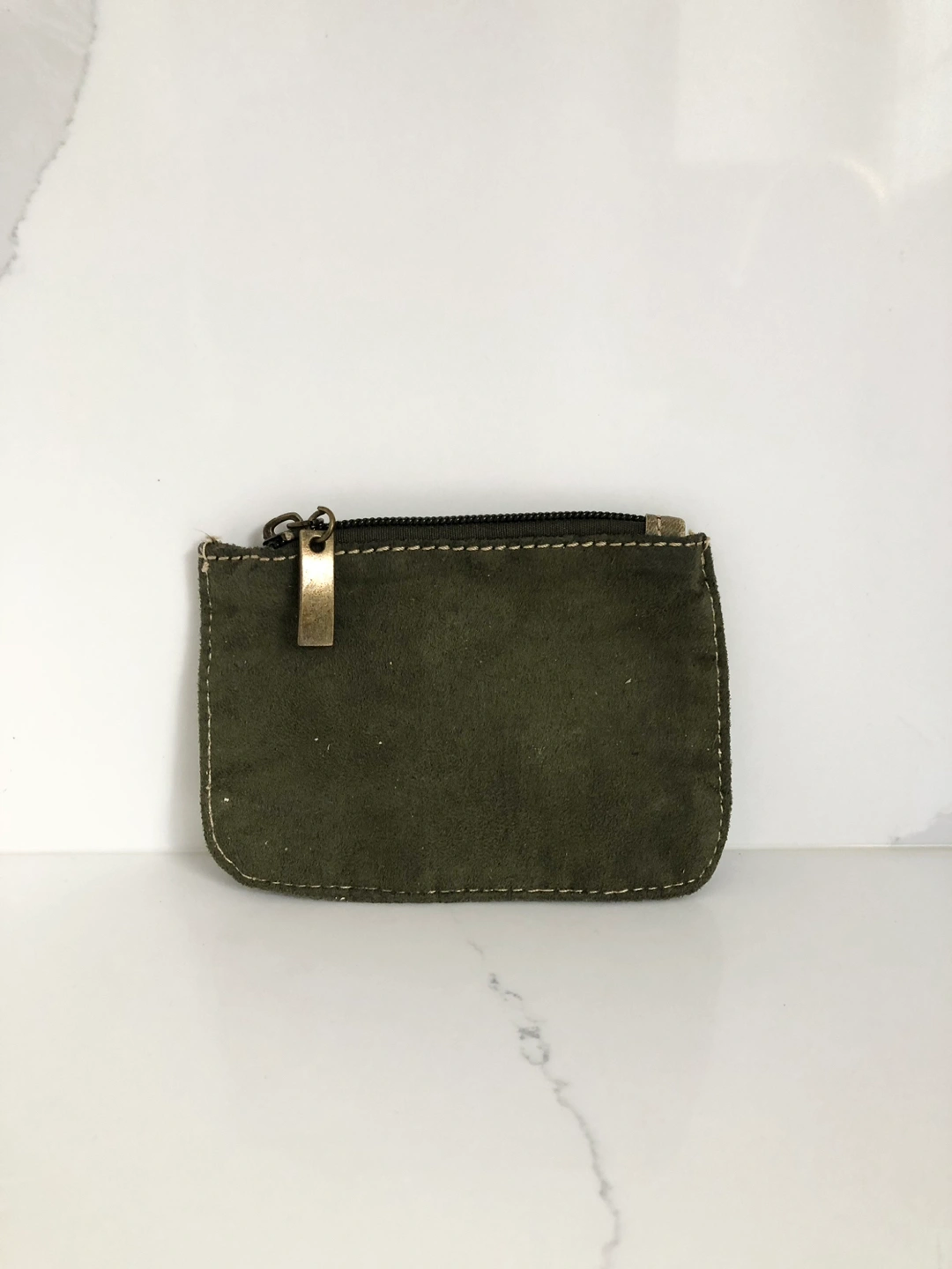 Oliver green in colour, this mini wallet has one zipper and is made of fabric. See second picture for size reference.